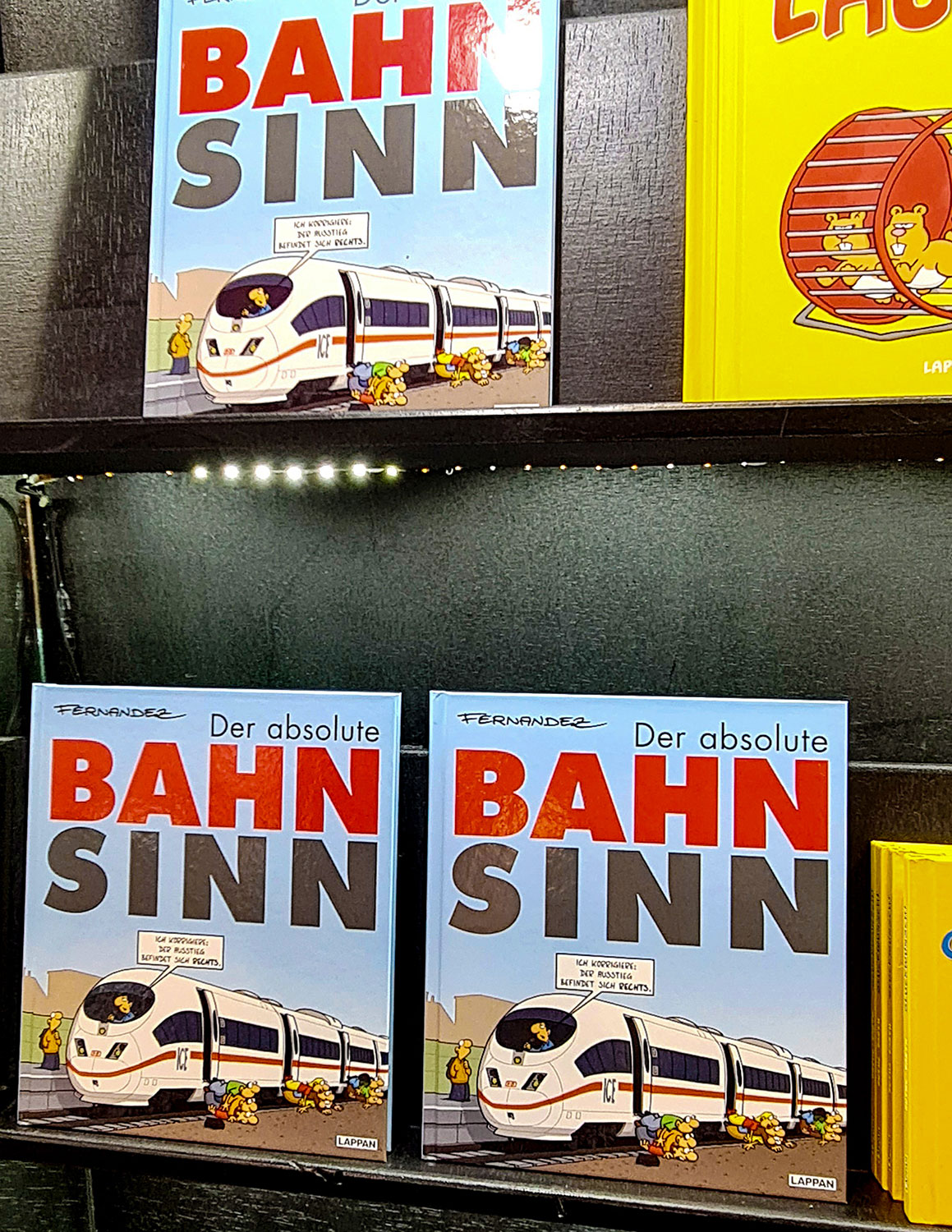 Wer ähnlichen Wahnsinn erlebt, dem empfehle ich – statt sich zu ärgern – Humor! Miguel Fernandez hat im „Bahnsinns-Buch“ über 200 Cartoons rund um die Schiene versammelt. Der Comic-Band ist im August 2022 im Lappan-Verlag erschienen.