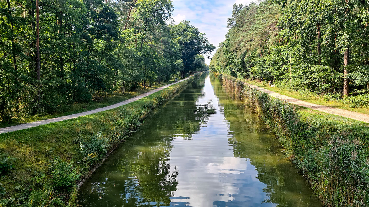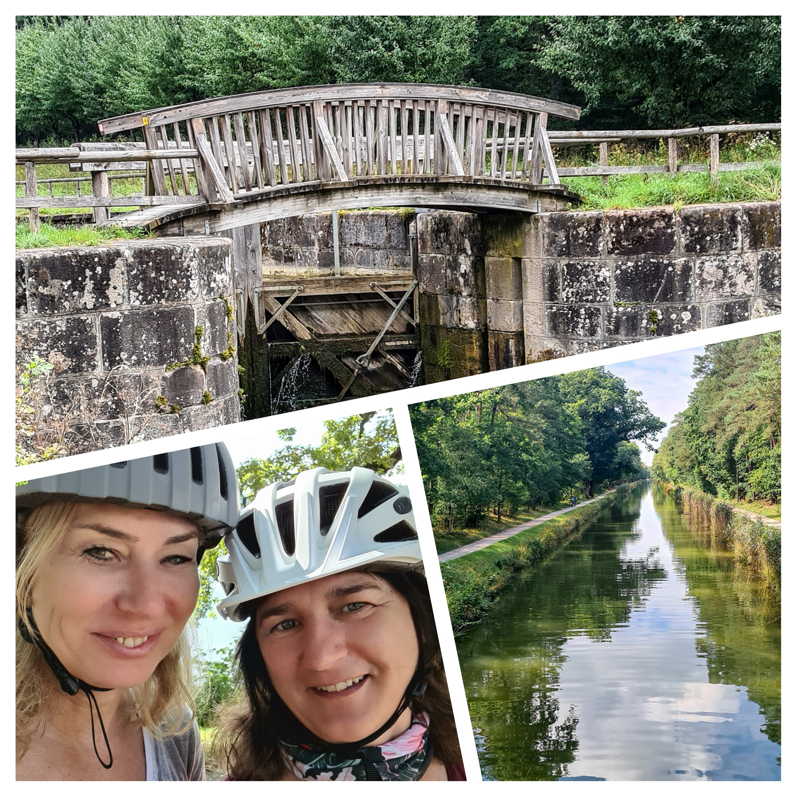 Rechts und links säumen Bäume die Wasserstraße, mal waren es Obstbäume, dann wieder Alleen aus Eichen. Regelmäßig gab es eine Schleuse, da gings dann mit Schwung einen kleinen Hügel hinunter und schnurstracks gerade aus weiter. Der Weg auf den ehemaligen Treidelpfaden war gekiest und eben. Es stellte sich ein bisschen Monotonie ein. Das fanden wir aber gut, denn so konnten wir uns unterhalten oder unseren Gedanken nachhängen und uns dem Fahrgenuss hingeben, ohne abgelenkt zu sein.