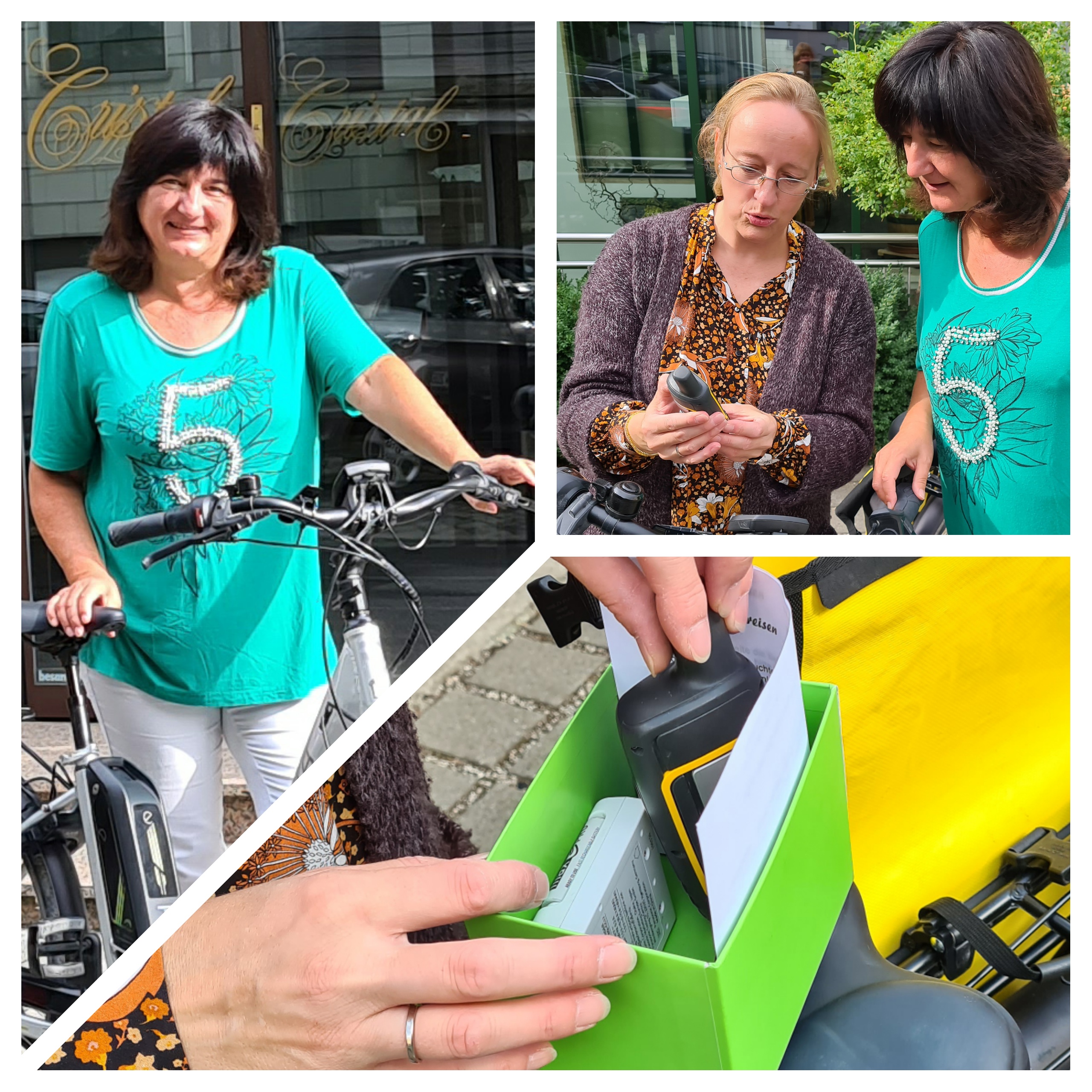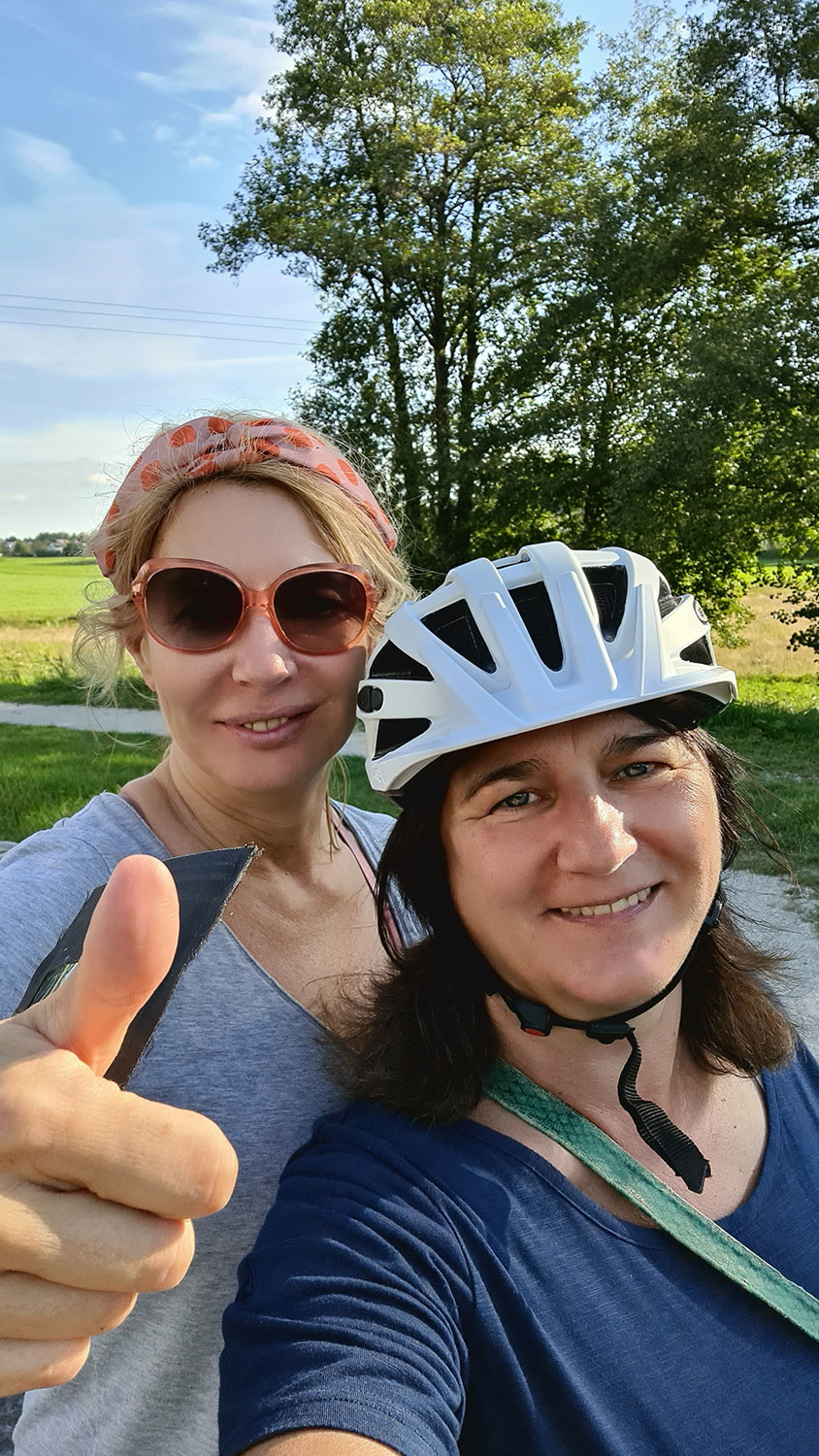Wir, das sind Hildegard aus Hamburg auf dem eigenen normalen Fahrrad und Heike aus Stuttgart auf dem geliehenen E-Bike.