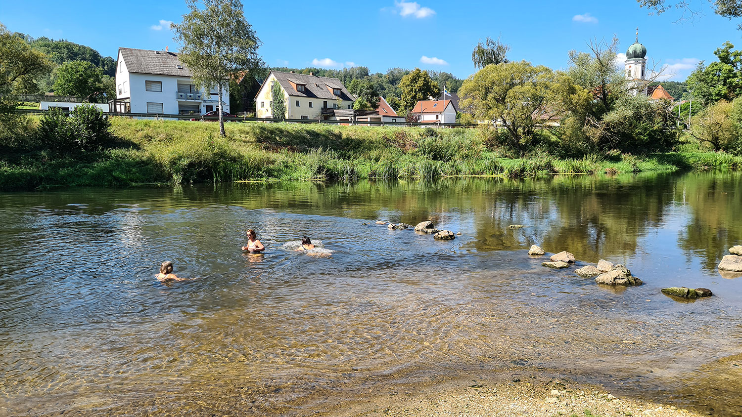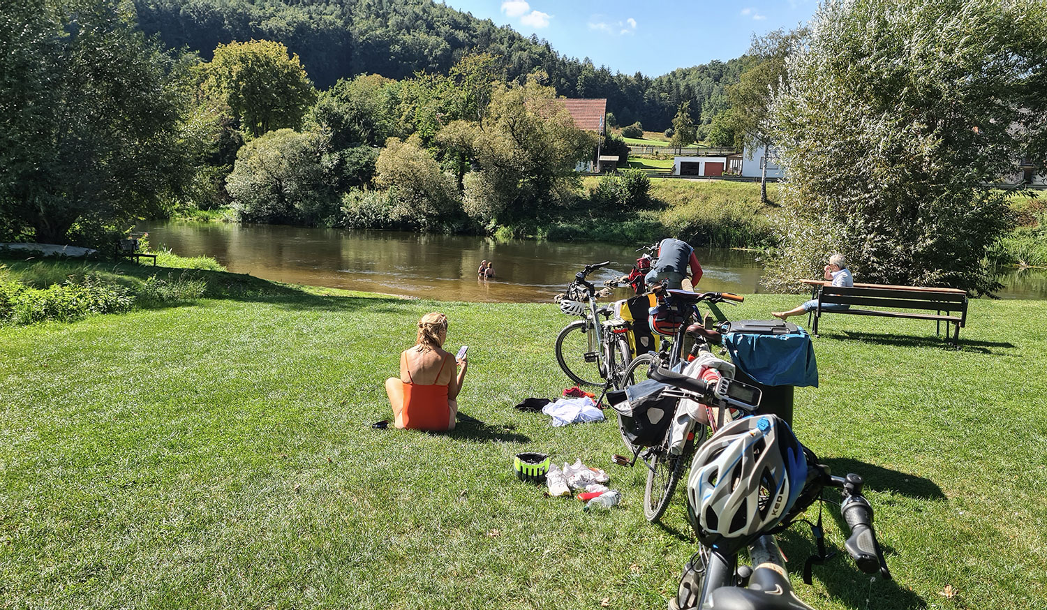 Hier hätten wir ewig liegen bleiben können… Irgendwann haben wir uns dann doch aufgerafft und uns wieder auf die Räder geschwungen. Richtig weit sind wir nicht gekommen, denn in Duggendorf lockte schon die nächste Badestelle. Mit Tischen und Bänken zum Rasten und Umkleidekabine.