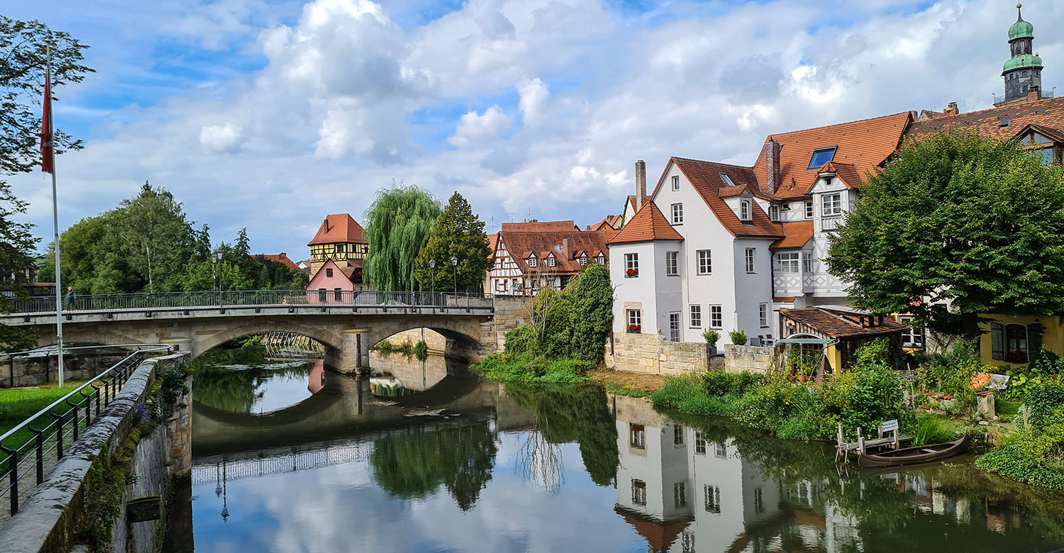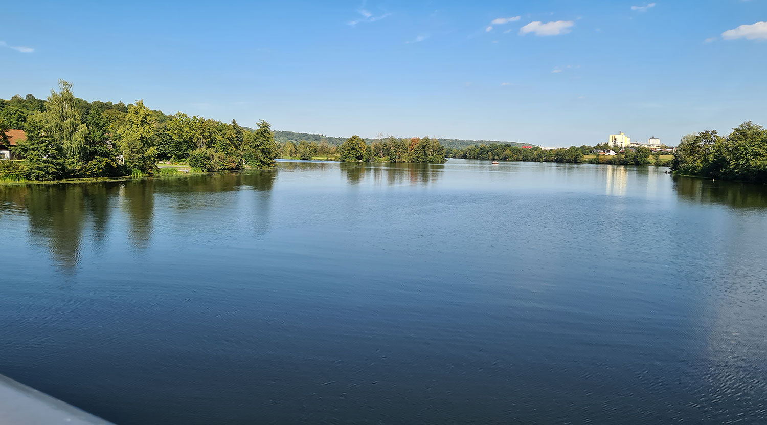 Ein Tag in Weiß-Blau! Spätsommer in Bayern ist, wenn Flussblau und Himmelblau ineinander über gehen und abends wieder alles gut ist. Auch beste Freundinnen geraten mal aneinander: Die eine möchte hier einen Stop einlegen, die andere dort, die eine will lesen, die andere fernsehen … Kennst du das? Wir haben für gestern beschlossen, dass jede mal ihrer Wege radelt und wir abends unsere Erlebnisse austauschen. Das tut der Seelenhygiene gut. Ebenso der Wechsel vom Doppel- in zwei Einzelzimmer. Ein Anruf bei Oliver Lowig, und schon war das Problem gelöst. Danke Franken Radreisen für die unkomplizierte und prompte Änderung.