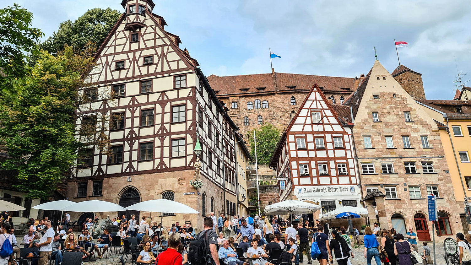 Den offiziellen Auftakt zu unserer Fünf-Flüsse-Tour machte am späten Nachmittag eine Stadtführung mit dem Rad durch Nürnbergs Altstadt. Stadtführer Bernd Krause hat sein Wissen sehr unterhaltsam mit uns geteilt, das hat richtig Spaß gemacht. Wir haben Interessantes über die Familie Dürer erfahren und dank Bernd Krause den Blick dafür geschärft, dass über der Nürnberger Burg die fränkische Fahne etwas höher hängt als die bayerische Fahne. Ein Schelm, wer Böses dabei denkt. Unbedingt sehenswert sind auch der „Schöne Brunnen“ mit dem Ring und der Hans-Sachs-Brunnen, der Szenen einer Ehe darstellt.