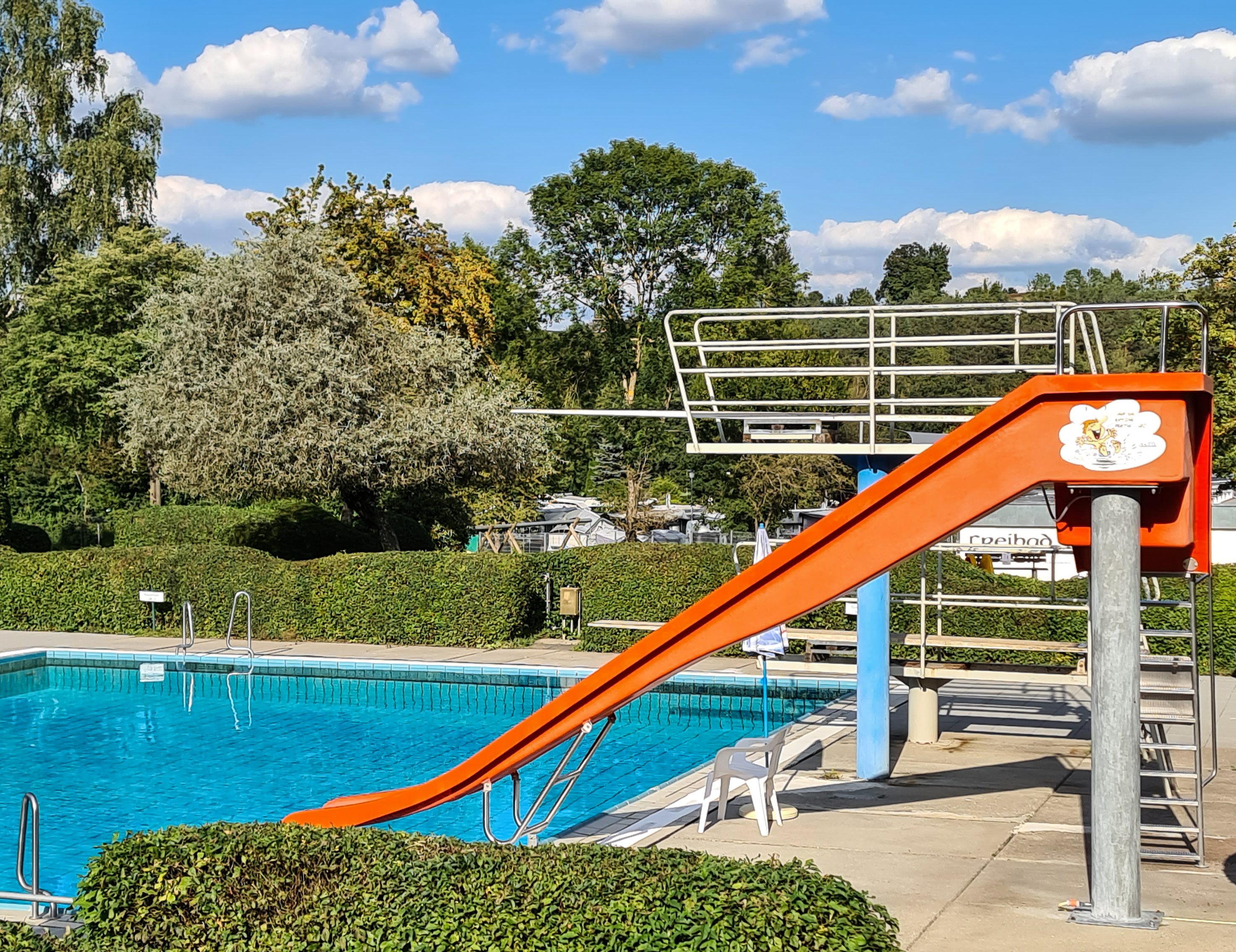 Weiter geradelt sind wir dann auf der ehemaligen Bahntrasse, ganz relaxed, ohne große Steigung und Krümmung. Und immer wieder tauchte die Vils neben uns auf, ganz ruhig, fast stehend wie ein See… Spontan haben wir in Rieden noch einen Badestopp eingelegt. Das Wetter war herrlich, das Freibad so schön und Maxl, der Bademeister, ist eine Institution.