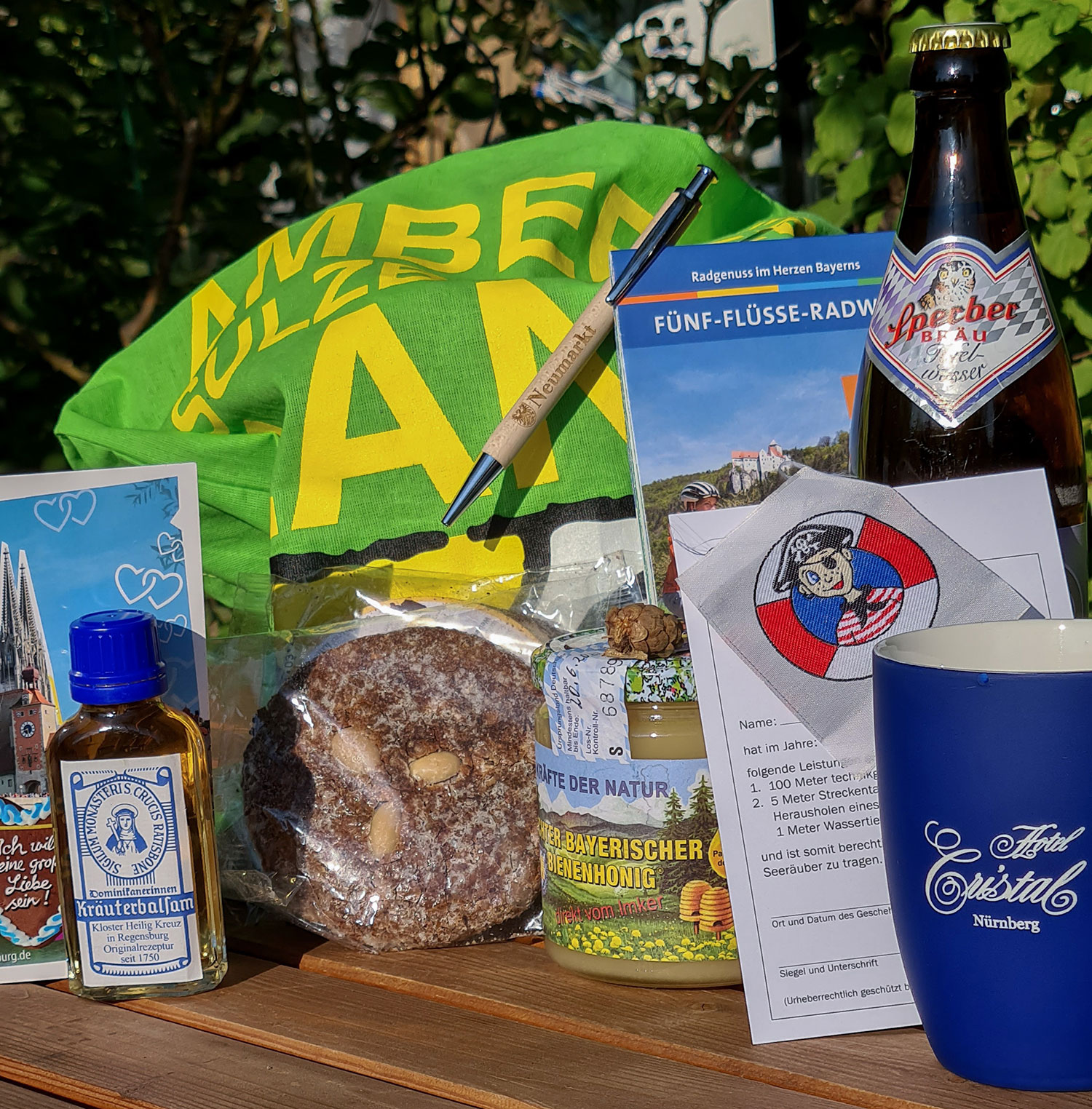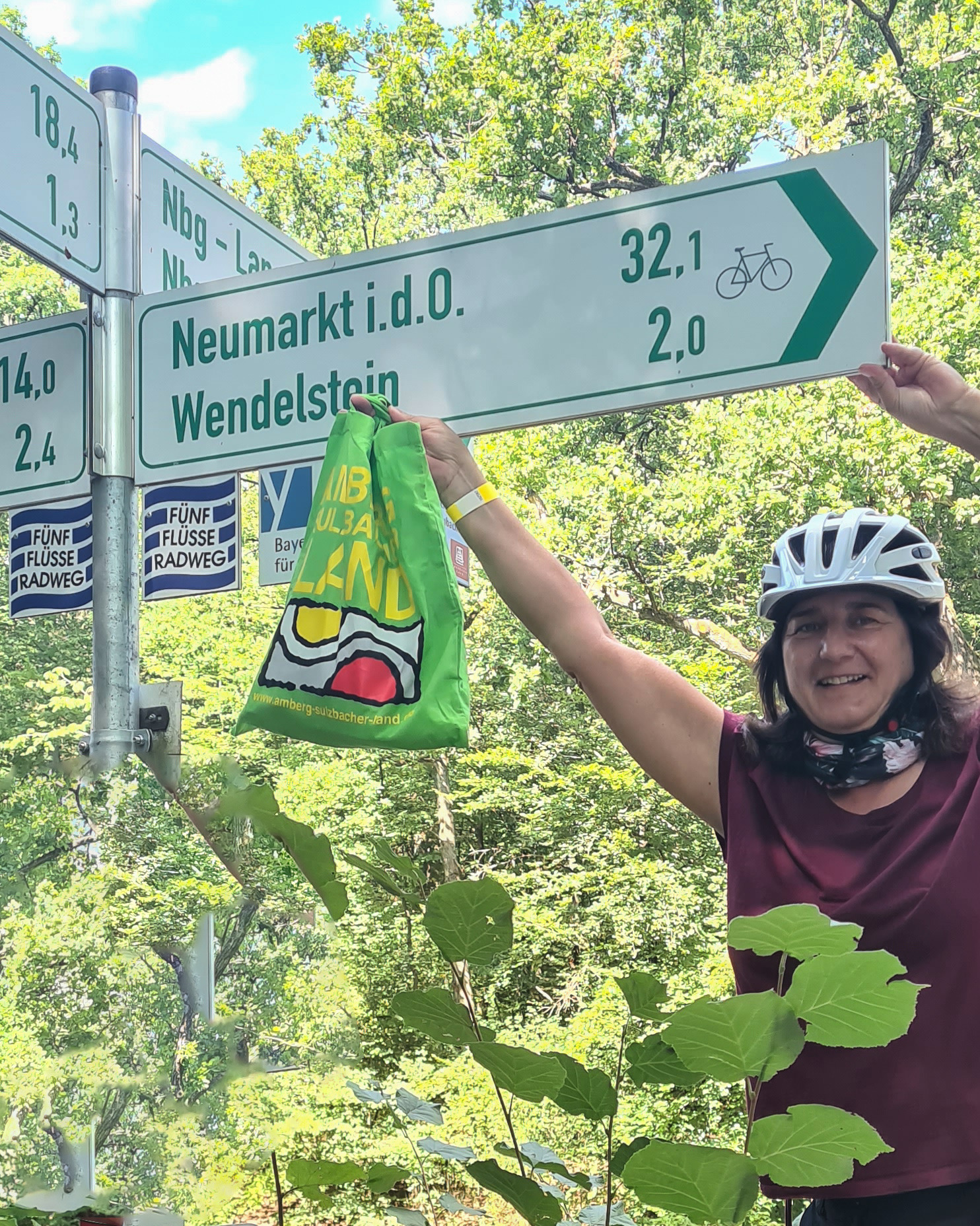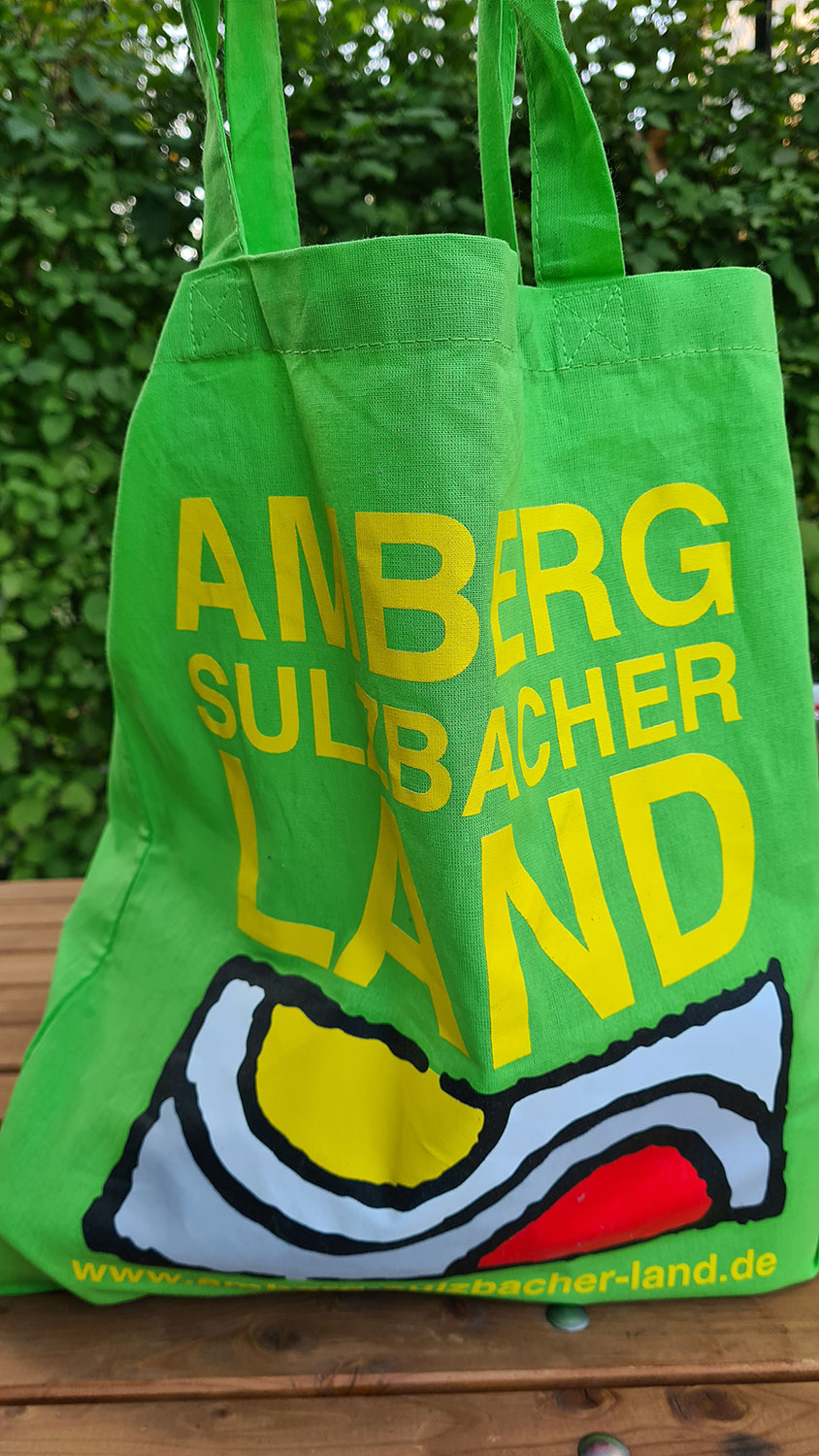 Ich habe Mitbringsel von meiner Radtour auf dem Fünf-Flüsse-Radweg im Stoffbeutel vom Amberg-Sulzbacher Land gesammelt.