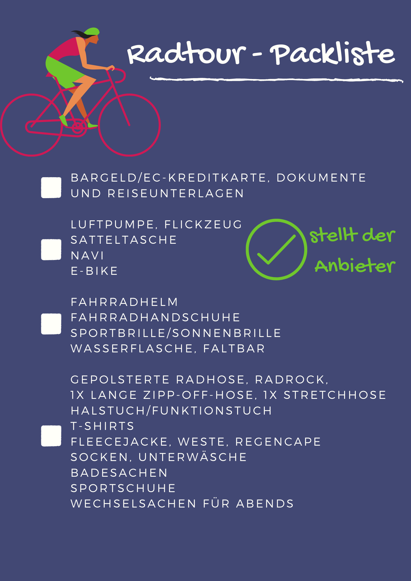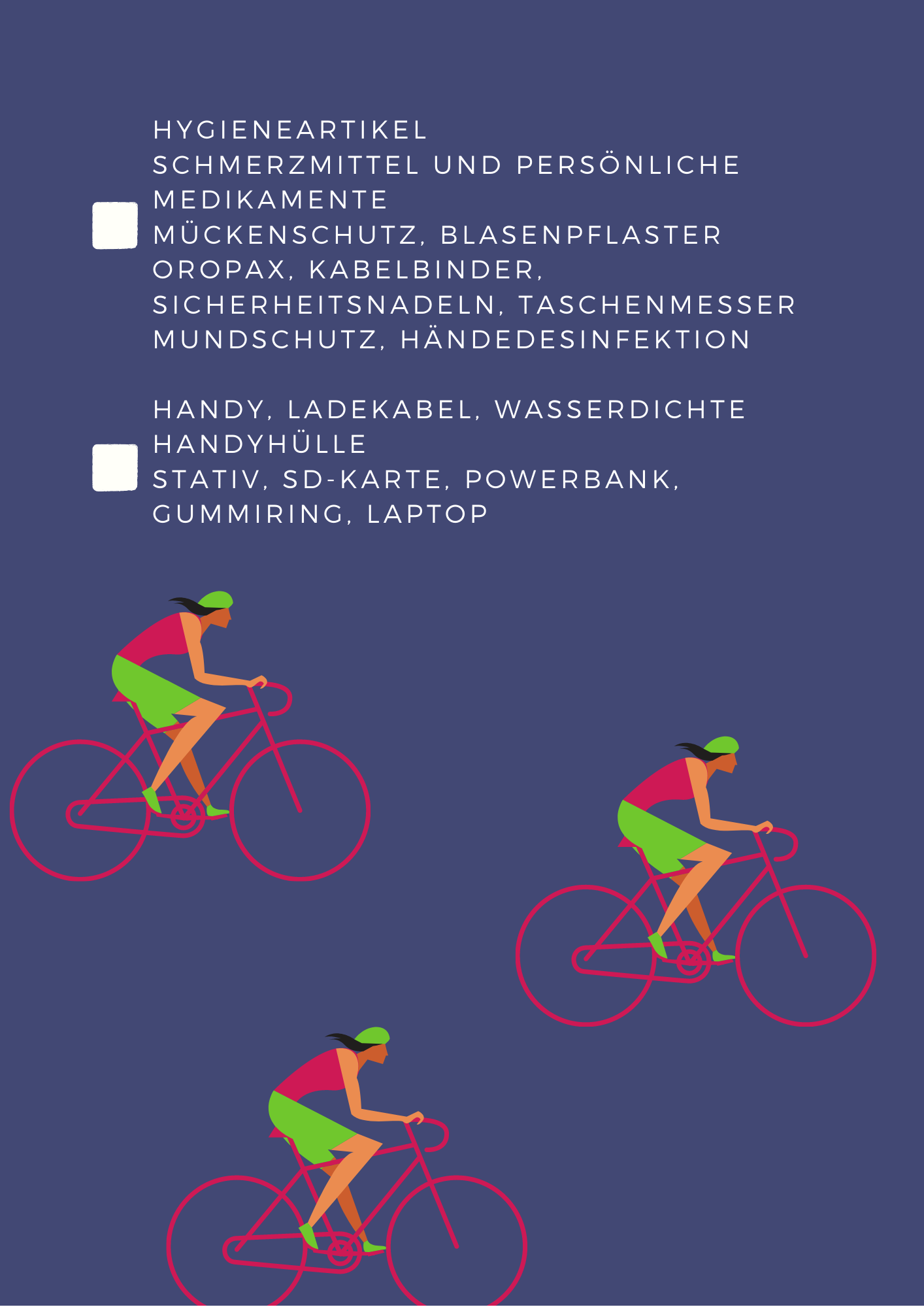 Die Sachen, die du für einen 6-tägigen Urlaub brauchst, befördert unser Gepäcktransport zuverlässig von Hotel zu Hotel. Dann gibt es noch die Sachen, die du am Rad täglich dabei haben solltest. Vergess bitte nicht, dass Radfahren ein Outdoorsport ist! Du solltest für jede Wetterlage die passende Kleidung dabei haben – Sonne wie Regen – Regenkleidung und Sonnencreme. Auch gibt es nicht alle zwei Kilometer einen Kiosk, also bitte immer etwas Proviant und – ganz wichtig – ausreichend Getränke dabei haben.
