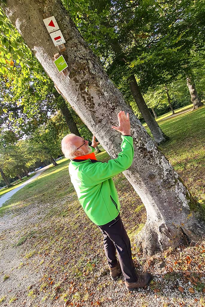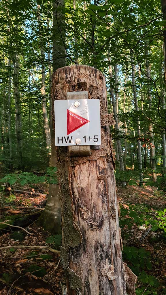 Wir überprüfen diese Regel beim Wandern entlang des Weges. Und ich bin verblüfft. Ja, das stimmt! Die Zeichen befinden sich schräg in Wanderrichtung am Baum. Früher seien diese mittig angebracht worden, erklärt mir Gerhard Stolz, doch das hat sich nun geändert. Am Baumstamm entdecke ich die Markierungen der „hochgehberge“. Das verleitet mich zur nächsten Frage: