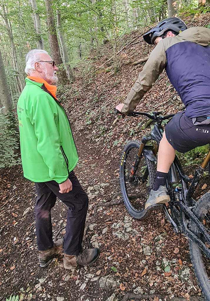 Unterwegs treffen wir auf einen Mountainbike-Fahrer. Gerhard Stolz erklärt ihm, dass Mountainbiker eigentlich gar nicht auf dem HW 5 fahren dürfen. Und er zeigt mir Stellen, wo der Weg durch die Fahrradfahrer abgenutzt und ausgefahren wird. „Es kann nicht sein, dass alle die Wege nutzen, aber nur wir die Arbeit machen.“ Am liebsten wäre es ihm, wenn die Mountainbiker gesonderte Wege bekommen. Wie erreichen den Gießstein und diskutieren, ob solche Felsen abgesichert werden müssen. Die Meinung der Wegewarte ist eindeutig. Nein, man könne das gar nicht leisten. Hier solle man lieber auf die Vernunft der Wanderer vertrauen. Zum Schluss will ich noch wissen: