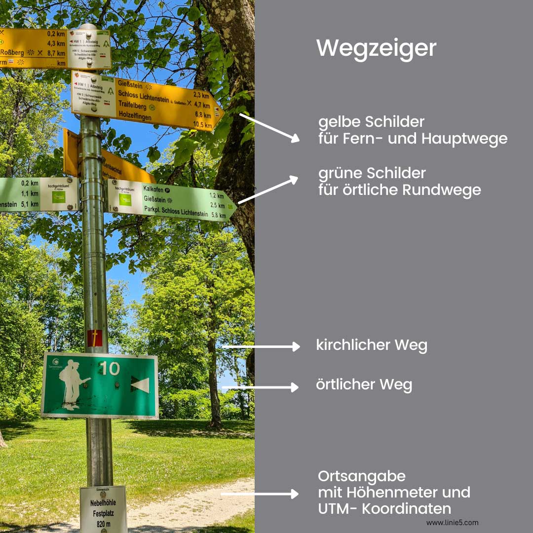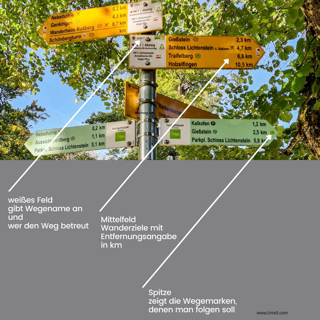 Gelbe Schilder sind für die Hauptwege und Fernwanderwege des Schwäbischen Albvereins reserviert. Grüne Schilder kennzeichnen örtliche Rundwege.