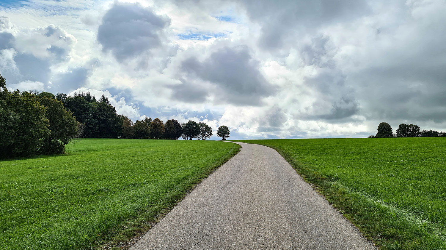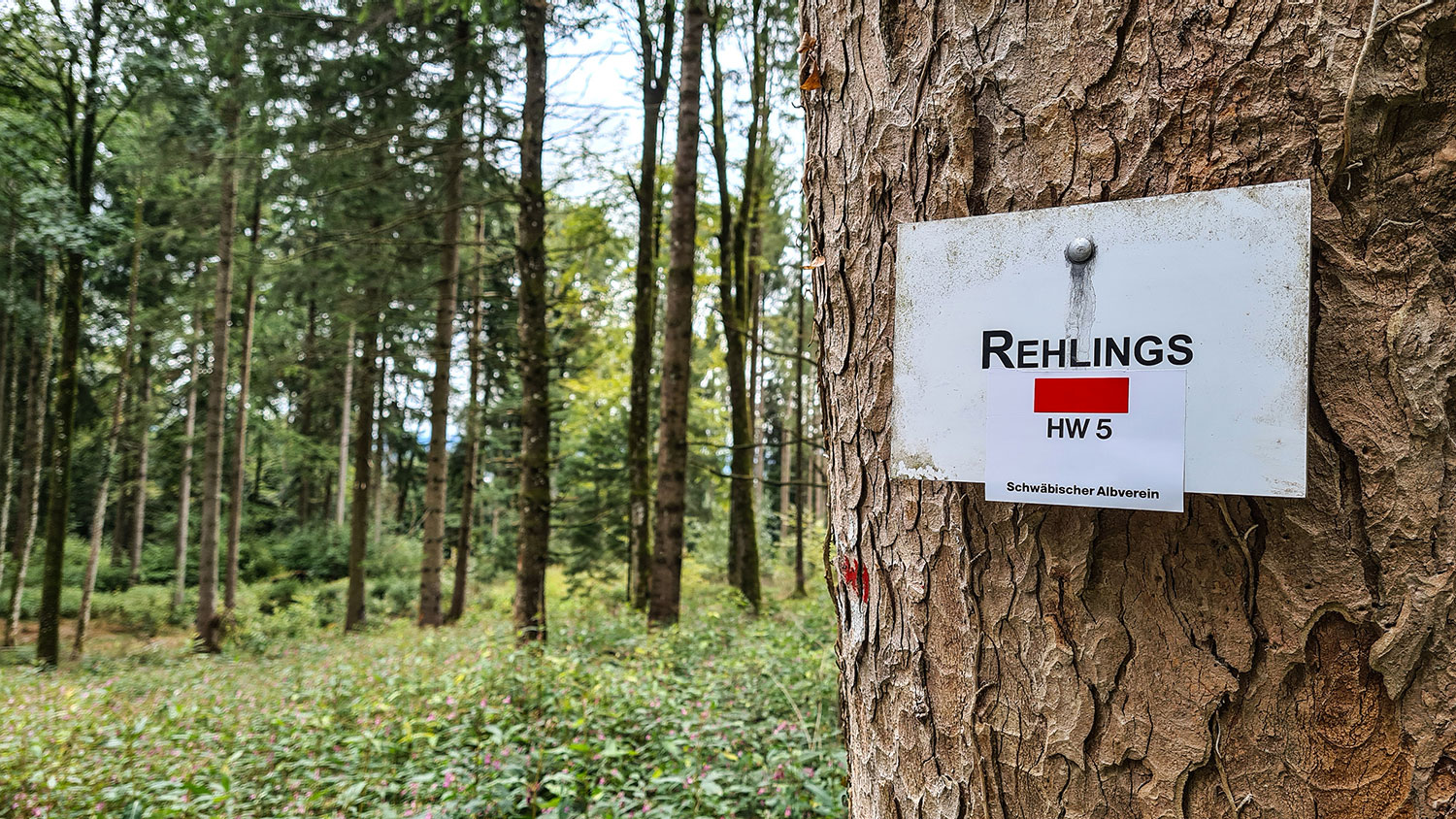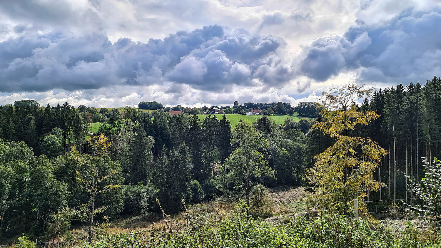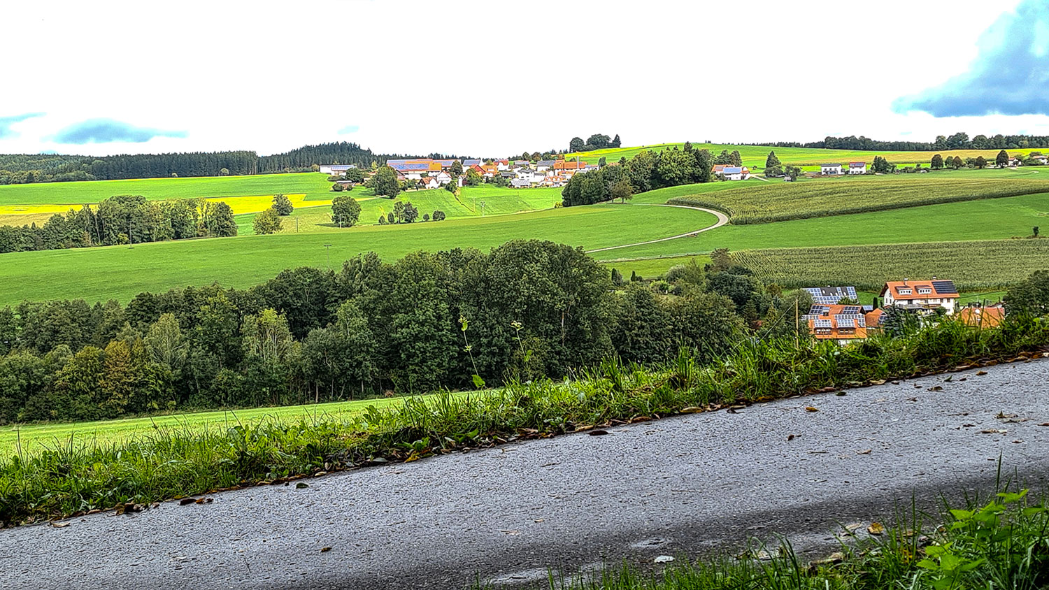 Am Waldrand steht eine Bank mit schöner Aussicht zurück auf Gospoldshofen direkt unter mir und Wengenreute am Horizont. Entlang der Teerstraße führt der HW 5 mich weiter, vorbei am Briefkasten des Bergjock und anschließend in den Wald.