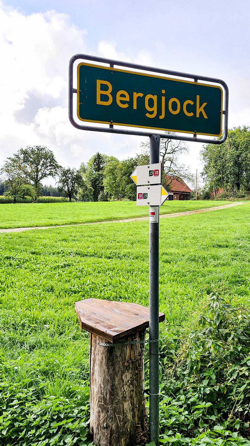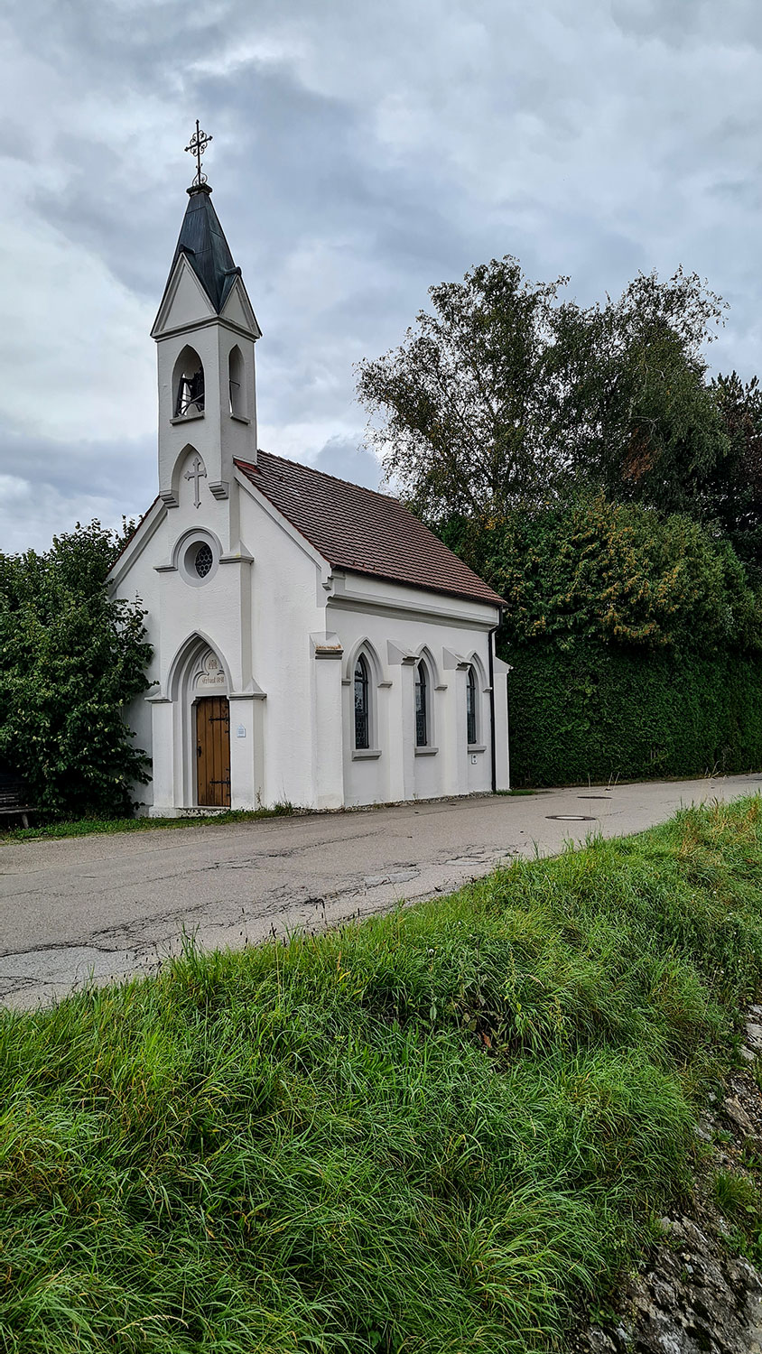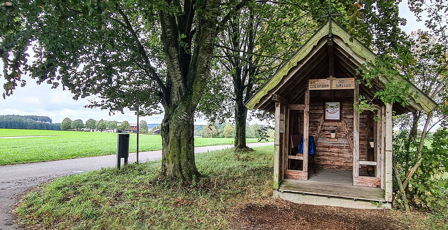 Ich starte meine Wanderung an der Käserei Vogler in Gospoldshofen. Ein kurzer Blick in die kleine Kapelle und dann geht es durchs Dorf, vorbei an der Bushaltestelle und rechts ab, auf geteerten Wegen den Hügel hinauf Richtung Starkenhofen.