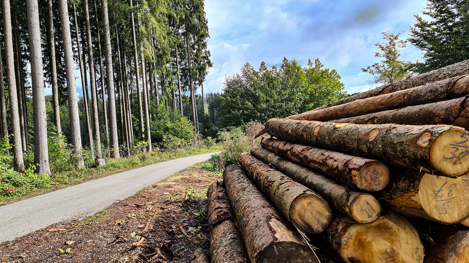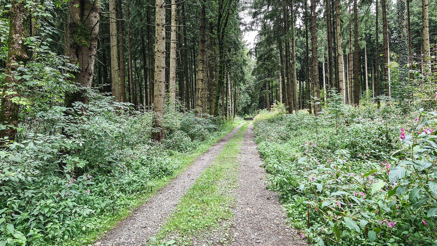 Der geschotterte Waldweg führt durch Nadel- und Laubbäume, zunächst eben, dann stetig und später steil bergab.