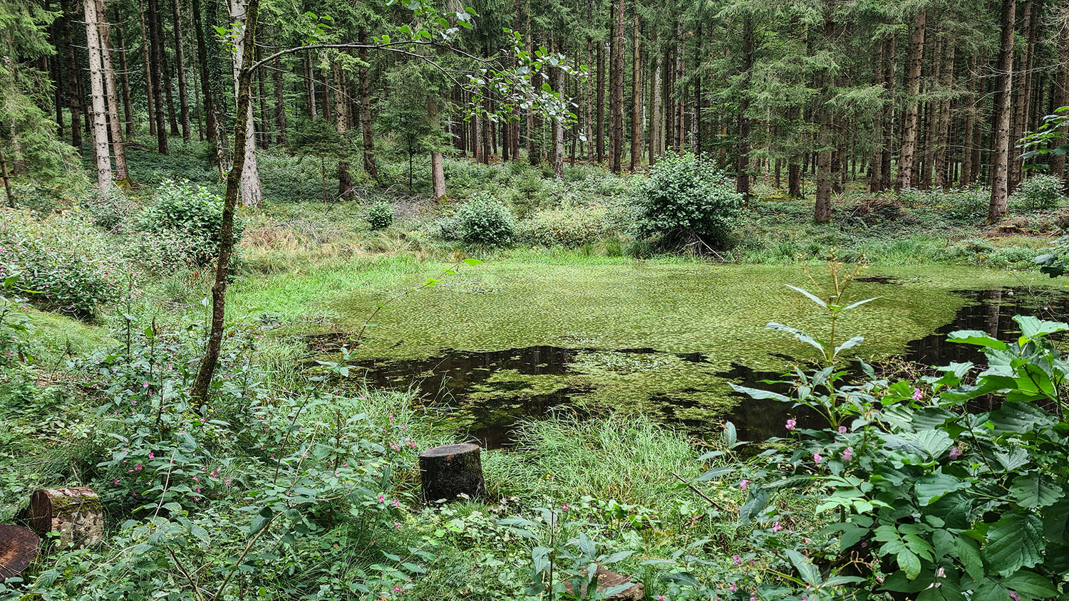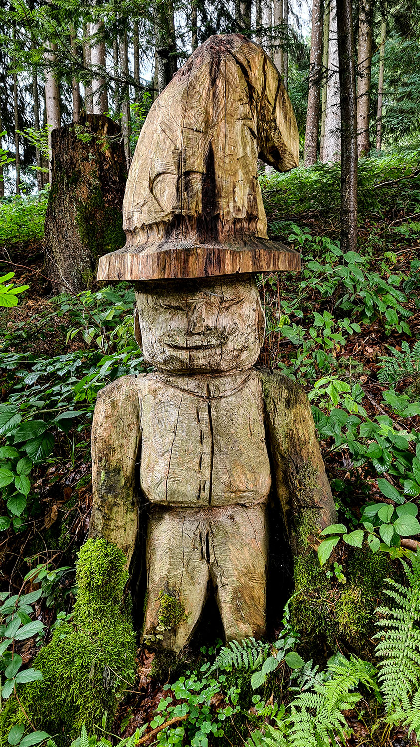 Eigentlich hätte ich längst auf Ralph treffen müssen. ‚Wahrscheinlich war ihm der steile Berg zu anstrengend‘, denke ich, ‚und er wartet unten‘. Ich komme an einem Waldtümpel vorbei, es geht noch einmal scharf links und dann bin ich schon bei den Teichen der Fischerei. Da erreicht mich seine Whats-App-Nachricht: Er habe sich im Wald verlaufen und ist erst jetzt oben am Wachtbühl angekommen. Da ich den steilen Berg nicht mehr hinaufsteigen möchte, einigen wir uns darauf, dass Ralph in aller Ruhe rastet und dann zum Auto, das er in Herbrazhofen geparkt hat, zurückkehrt während ich weiter nach Leutkirch wandere.