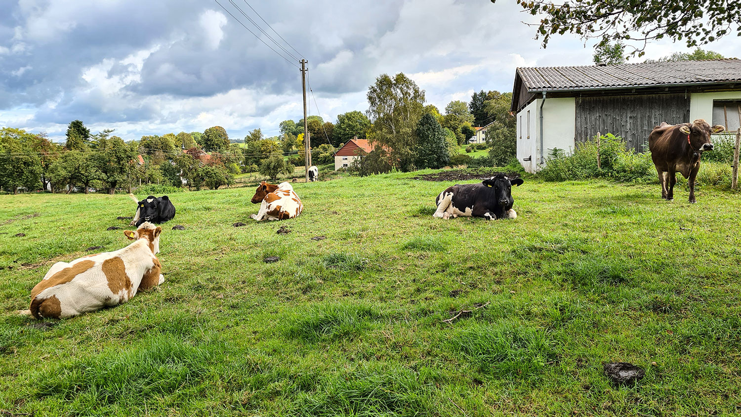 Es geht hinauf und ins Tal hinab und dann nocheinmal hinaus bis ich schließlich Starkenhofen erreiche. Der Ort besteht nur aus ein paar Gehöften, ich komme an einer Weide mit Milchvieh vorbei. Wahrscheinlich gehören sie zu einem der wenigen Landwirte, welche die Käserei Vogler beliefern.