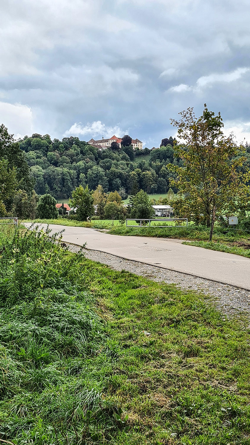 Beim Blick zurück, entdecke ich das Schloss Zeil auf der Anhöhe.