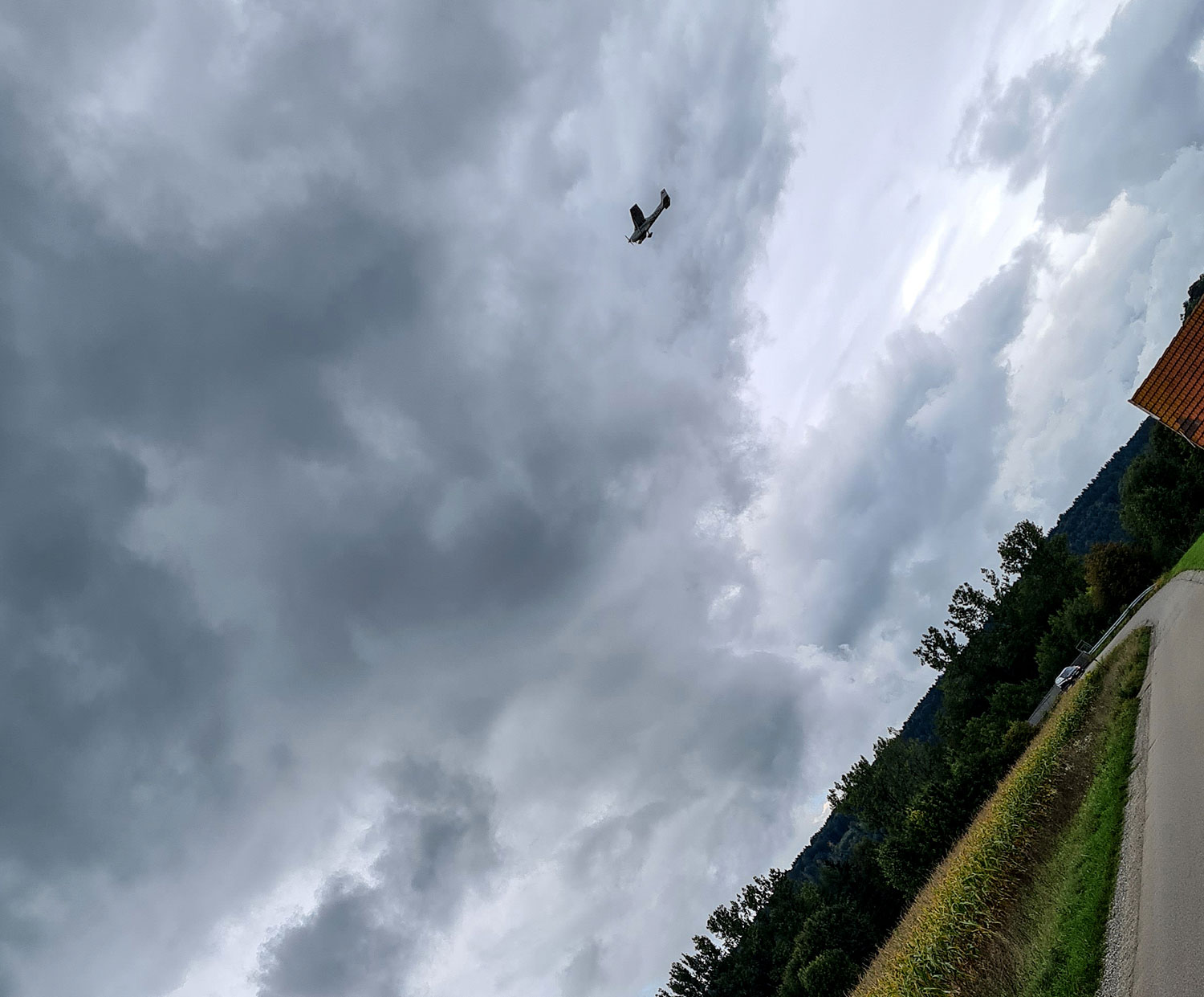 Also setze ich meine Wanderung durch Herbrazhofen fort, überquere die Aach und die Autobahn und schreite dann im weitläufigem Tal auf geteerten Wegen bis zum Ortsrand von Leutkirch. Über mir dröhnen die Motorflieger von Unterzeil und ich sehe die Fallschirmspringer hinausspringen und in Bögen nach unten gleiten.