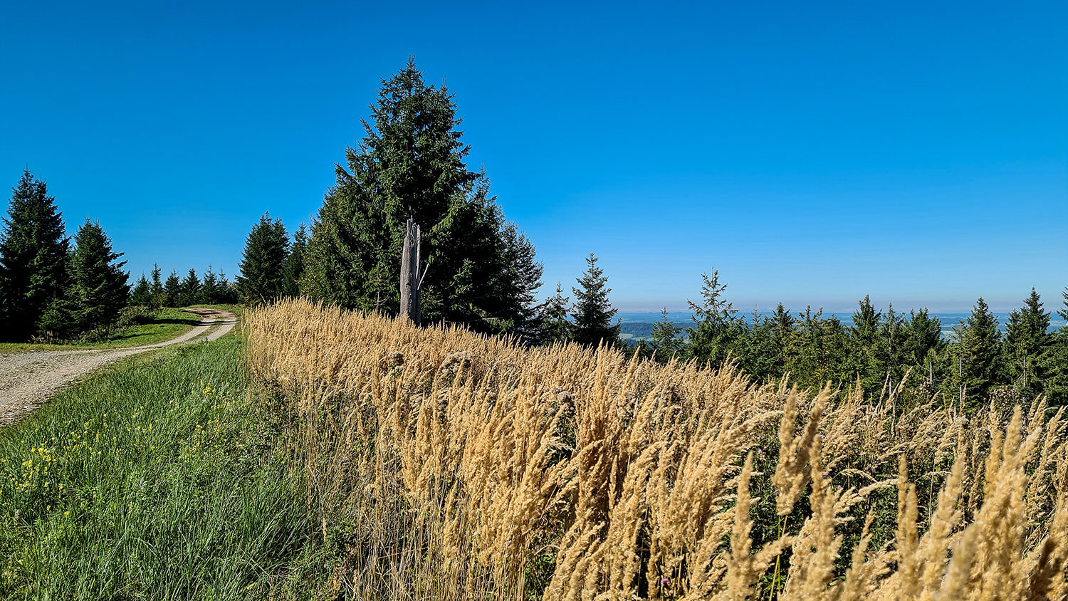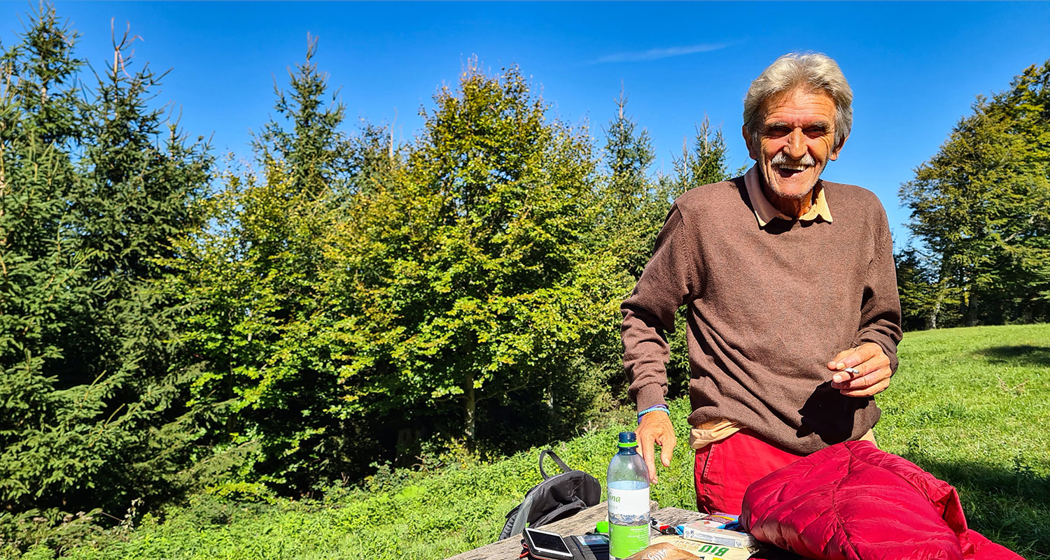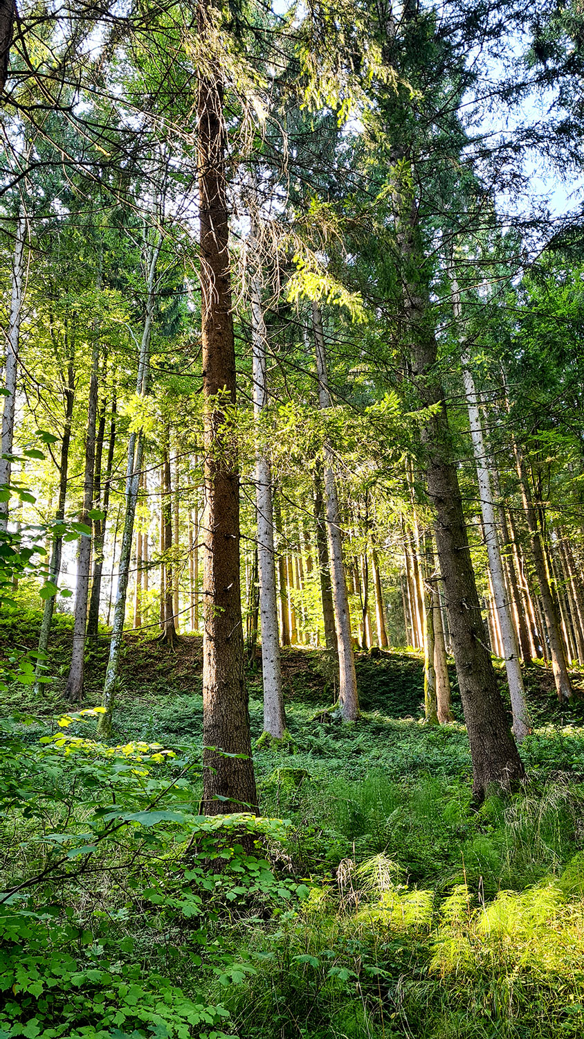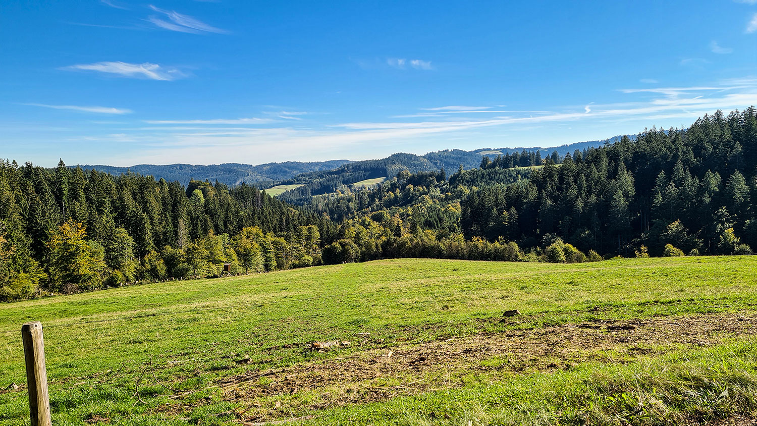 Auf dem Bergrücken wechseln sich bewaldete und offene Abschnitte ab. Und immer wieder gibt es schöne Ausblicke. Als ich mich einer Lichtung nähere, höre ich klassische Musik. Sie kommt aus einem Smartphone, das dort auf einer Rastbank liegt und gehört einem Mann, der andächtig lauscht. Er bemerkt mein Kommen und erzählt mir, dass er oft hier oben sei und den Ort mit genieße. Ich erfahre, dass er lange in Isny in einer Klinik gearbeitet und in Rohrdorf im Forsthaus gewohnt hat. Seit der Coronazeit verbringt er das halbe Jahr im Sinai in Ägypten bei den Berberfamilien.
