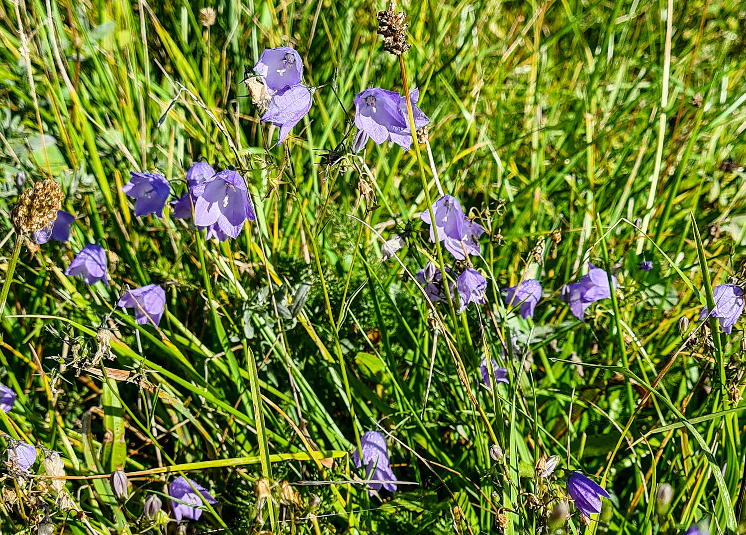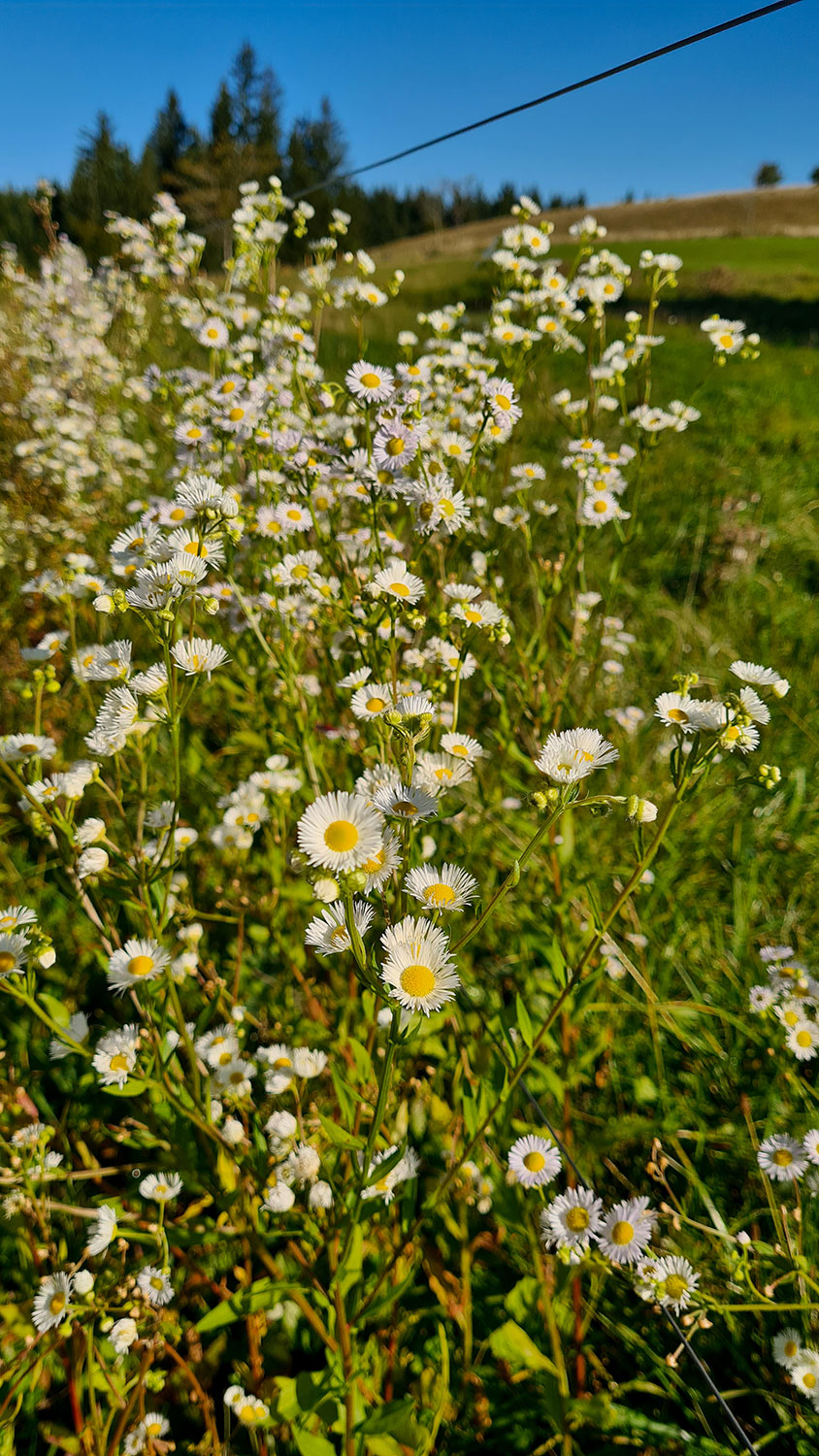 Die Sonne zaubert die letzten Tauflecken von der Wiese, Glocken- und Flockenblumen blühen um die Wette und am Wegesrand duftet es nach Kamille. Diese Wanderung am Morgen ist einfach nur herrlich.