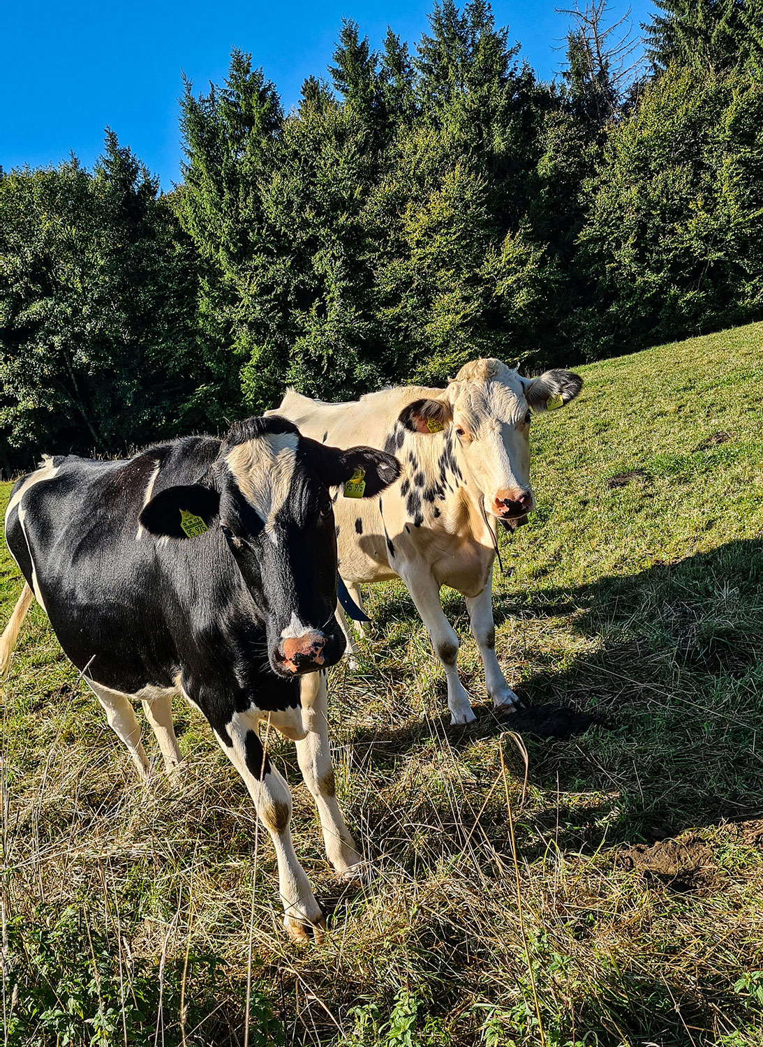 Beim ersten Gehöft grasen Rinder auf der Weide. Das wundert mich, war ich vergangenen Samstag doch beim Almabtrieb. Es sind wohl ein paar oben geblieben. Ein grüner Jeep fährt an mir vorbei. Zur Erinnerung mache ich schnell ein Foto. Das scheint dem Förster nicht zu gefallen, denn auf dem Rückweg hält er an und fragt misstrauisch nach, warum ich sein Auto fotografiert habe. Ich kann ihn beruhigen, und wir führen ein nettes Gespräch über Wölfe und Weidewirtschaft. Aber, so versichert er mir, hier oben hätte er noch keinen gesichtet. In der Adelegg sei Rotwild beheimatet und an den steilen Hängen der Tobel auch Gämse.