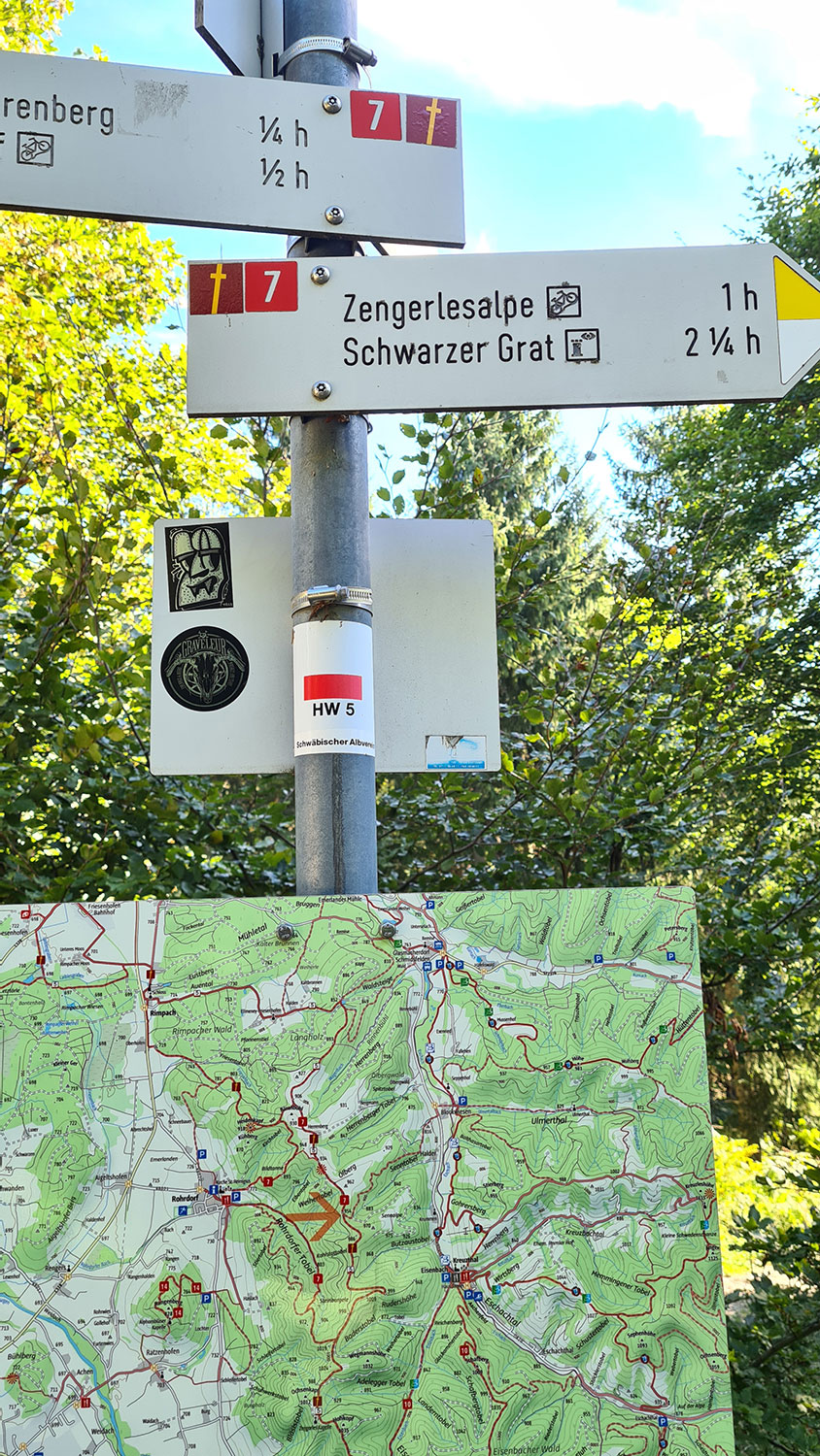 Die letzten Kilometer des Fernwanderwegs stehen an. Hinter dem Kloster Rimpach geht es steil bergauf und dann über den Bergrücken der Adelegg bis zum Schwarzen Grat! Ralph und ich starten getrennt, meistern das letzte Stück zum Ziel aber gemeinsam! Wir werden mit einem grandiosen Rundum-Blick belohnt und sind glücklich!
