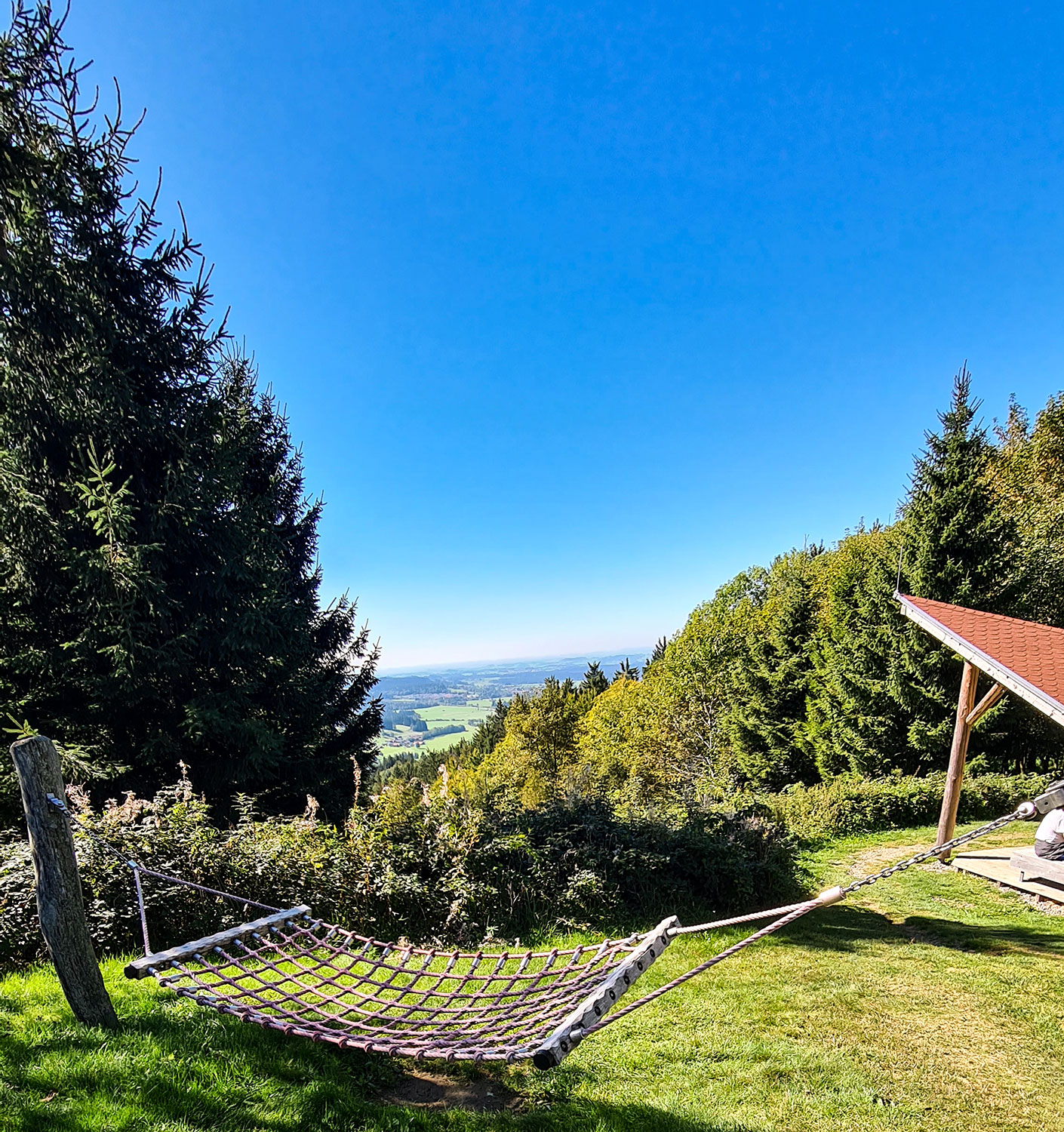An der Schletteralpe legen wir eine Ruhepause ein und erzählen uns gegenseitig, wie es uns ergangen ist. Eine halbe Stunde hängen wir hier ab, denn es ist ein schöner Picknickplatz mit „Himmelsgucker“-Bänken, Schutzhütte und Hängematten am historischen Sennerei-Standort „Schletteralpe“ kurz vor dem Schwarzen Grat.