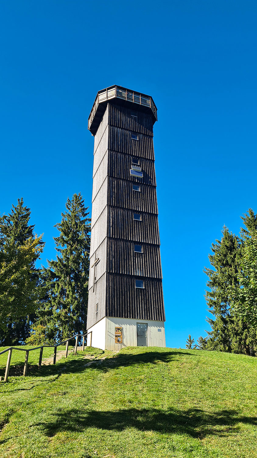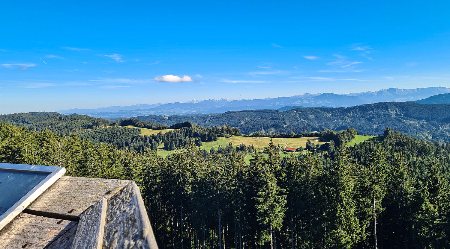 Der Rundblick vom 28 Meter hohen Aussichtsturm auf dem Schwarzen Grat ist grandios: Nördlich das württembergische Allgäu, westlich Bodensee und Säntis, südlich die Allgäuer und Lechtaler Alpen und östlich die Werdenfelser Berge mit der Zugspitze. Wir unterhalten uns mit zwei Wanderinnen aus der Weil der Stadt und machen gegenseitig Fotos.