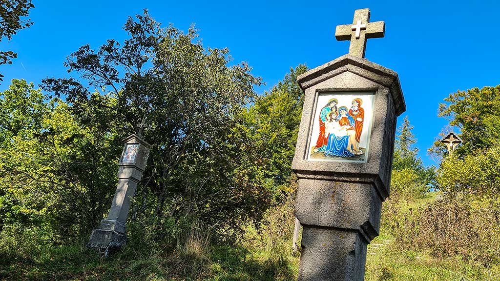 Wir halten uns nicht lange auf, sondern marschieren auf dem HW 5 zum Käpfle und steigen über den Kreuzweg ab. 14 Bildstöcke aus Sandstein säumen den steilen Passionsweg. Mir gefallen die bunten Darstellungen. Leider muss ich am Fuße des Kreuzbergs lesen, dass die Malereien Nachbildungen sind, da die ursprünglichen Holzschnitzereien in den 1990er-Jahren gestohlen worden sind.