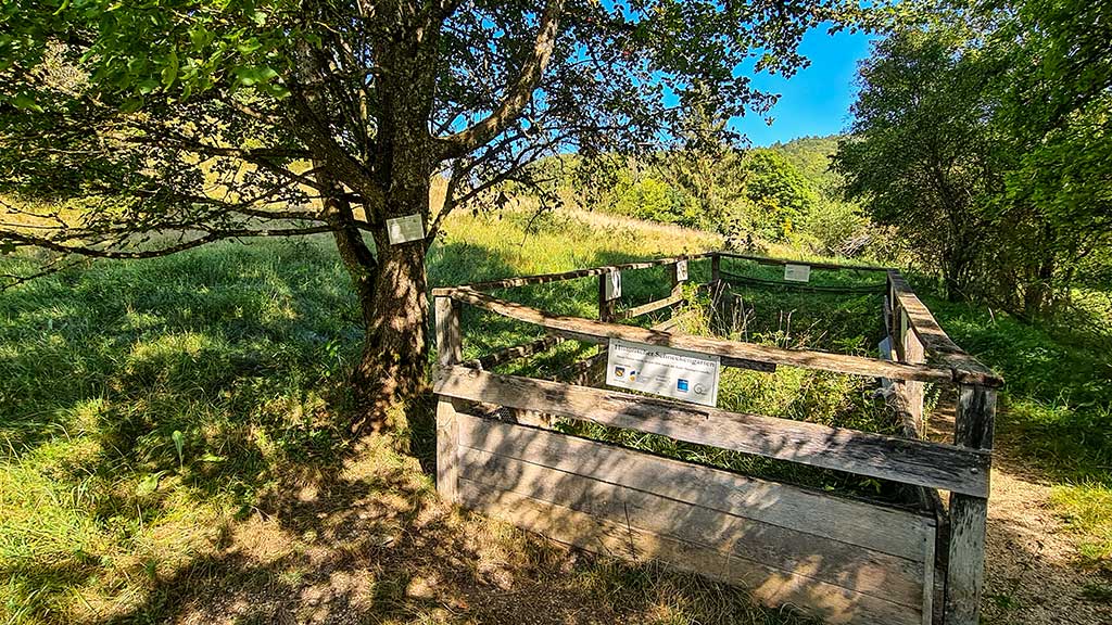 Darin wird aber kein Gemüse angebaut. Nein, das Unkraut wächst in die Höhe. Hühner oder Kaninchen sind auch nicht zu sehen. Es ist ein Schneckengarten nach historischem Vorbild. Die Infotafel klärt auf, dass in Weiler schon seit langer Tradition Schnecken gesammelt und gehandelt wurden. Die Bauern auf der kargen Schwäbischen Alb verdienten sich damit ein wichtiges Zubrot. Abnehmer waren die Klöster und der katholische Adel. Schnecken waren eine klassische Fastenspeise, weil sie nicht als Fleisch galten.