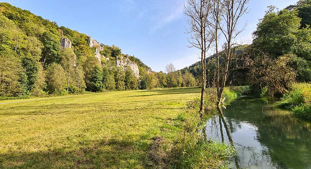 Der Weg führt von der Kläranlage unterhalb der Ruine Maisenburg zu einem schönen Grillplatz, an dem ist mächtig was los ist. Und dann mal wieder auf die andere Seite des Flüsschens zur Ölmühle. Dort vereint sich der HW 5 mit dem HW 2 und führt an den Felsen mit den Ochsenlöchern vorbei.