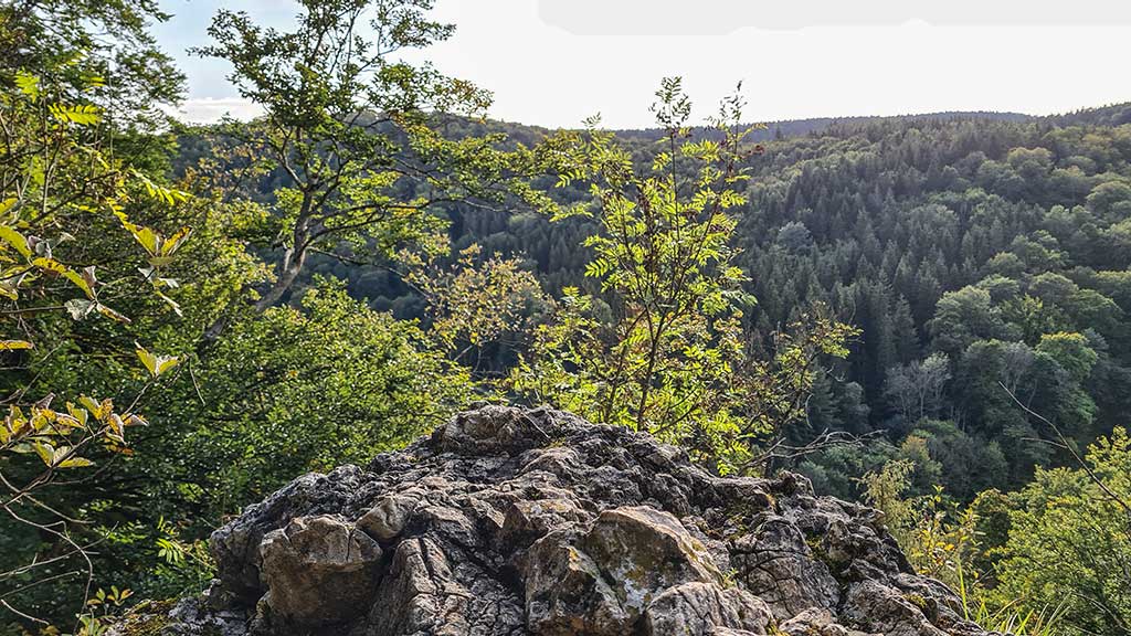 Nachdem ich jetzt zwei Tage alleine gewandert bin, habe ich den Sonntag mal wieder zusammen mit Ralph verbracht. Wir starten um 14 Uhr auf Burg Derneck. Ich zeige Ralph die schöne Aussicht und erzähle ihm, dass ich am Vortag hier Gerhard Geiselhart, den letzten Köhler seiner Zunft getroffen habe.