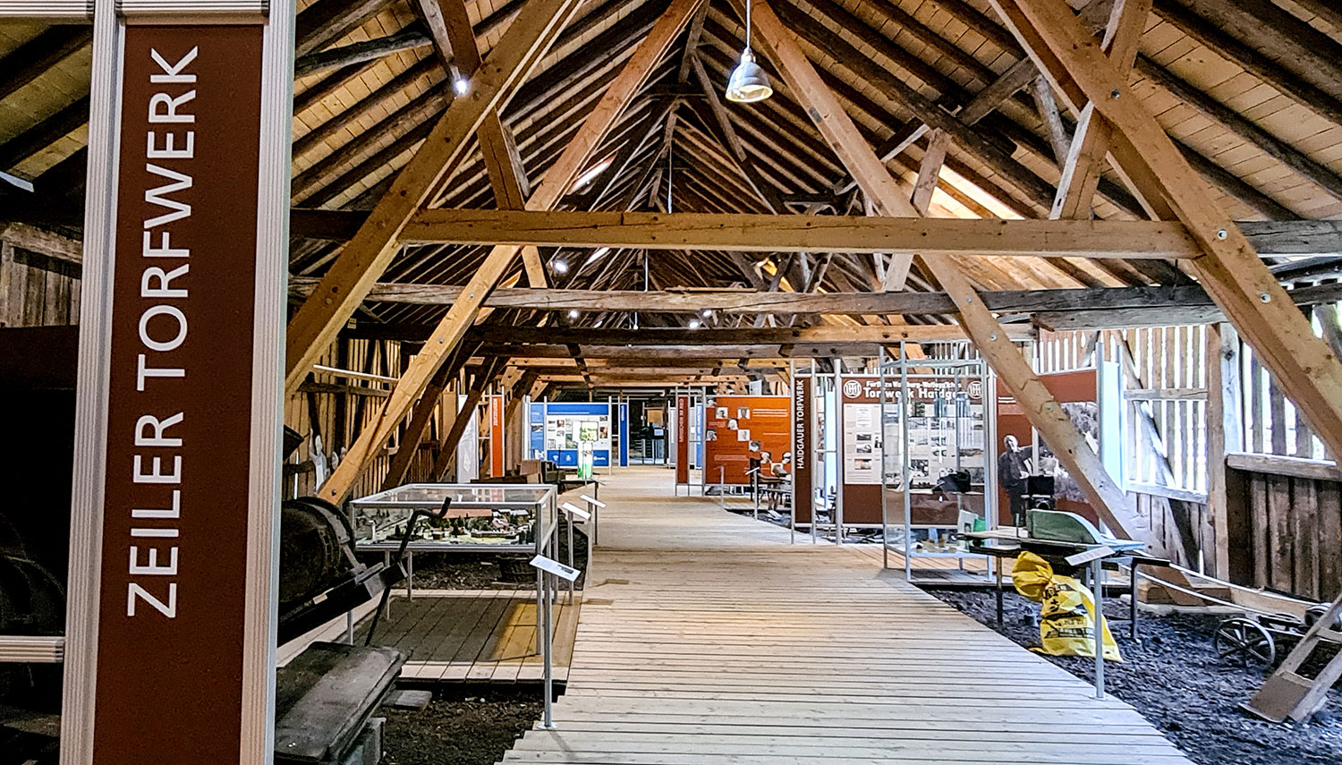 Zurück am Ausgangspunkt schauen wir uns noch ein bisschen im Museum um. Das, was wir eben gehört haben, wird ausführlich auf Infotafeln dargestellt. Außerdem kann man alte Maschinen und Werkzeuge bestaunen und den Märchen und Sagen rund ums Moor lauschen.