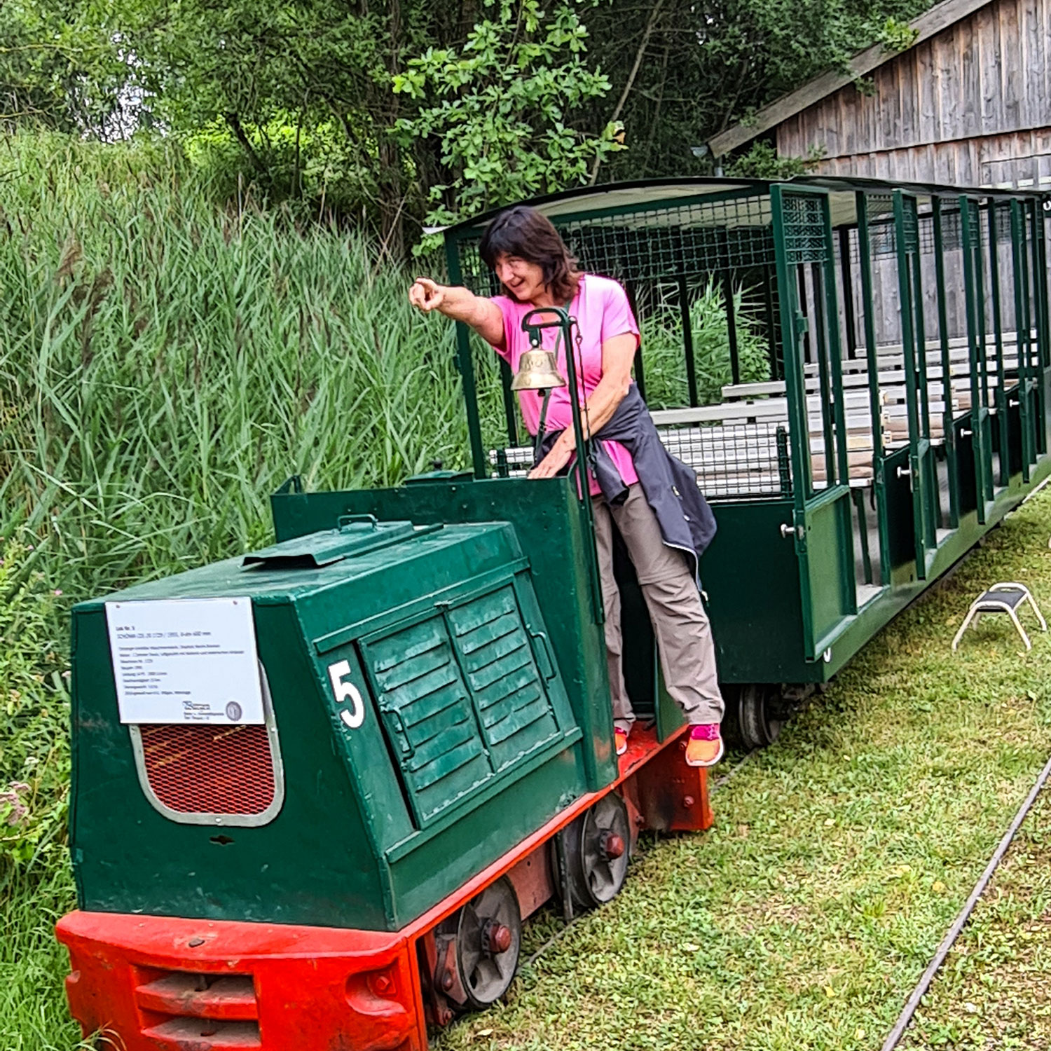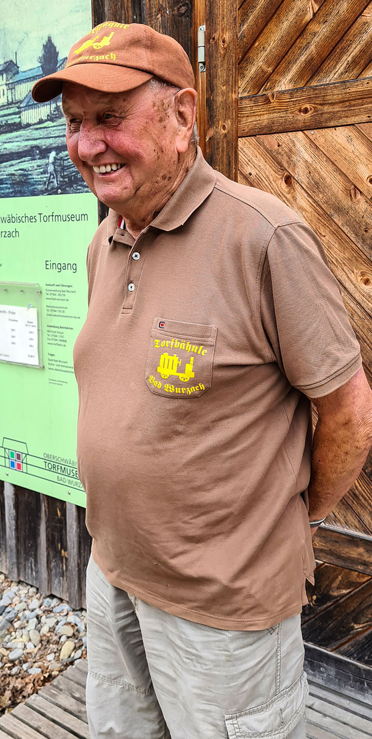 Wir haben Glück – an diesem Samstag rollen die Züge ins Moor. Ich freue mich riesig, dass es eine kleine Lok mit der Nr. 5 gab. Früher transportierten die Bahnen auf ihren Loren gestochene Torfstücke zum Trockenen in die Schuppen. Heute fahren mit dem Bähnle Besucher ins Moor. Unsere gemütliche Fahrt beginnt beim Torfmuseum und führt hinaus bis zu einem ehemaligen Haidgauer Torfwerk. Verrostete Kräne und Maschinen von der Verladestation stehen noch herum. Bei einem Halt an der Wendeschleife erfahren wir Interessantes über den Torfabbau, die Arbeit des Naturschutzes und den Bau der Torfbahn. Die Rentner des Heimatvereins von Bad Wurzach haben dieses Stück Geschichte mit viel Eigenleistung erhalten und erlebbar gemacht. Vielen Dank dafür.