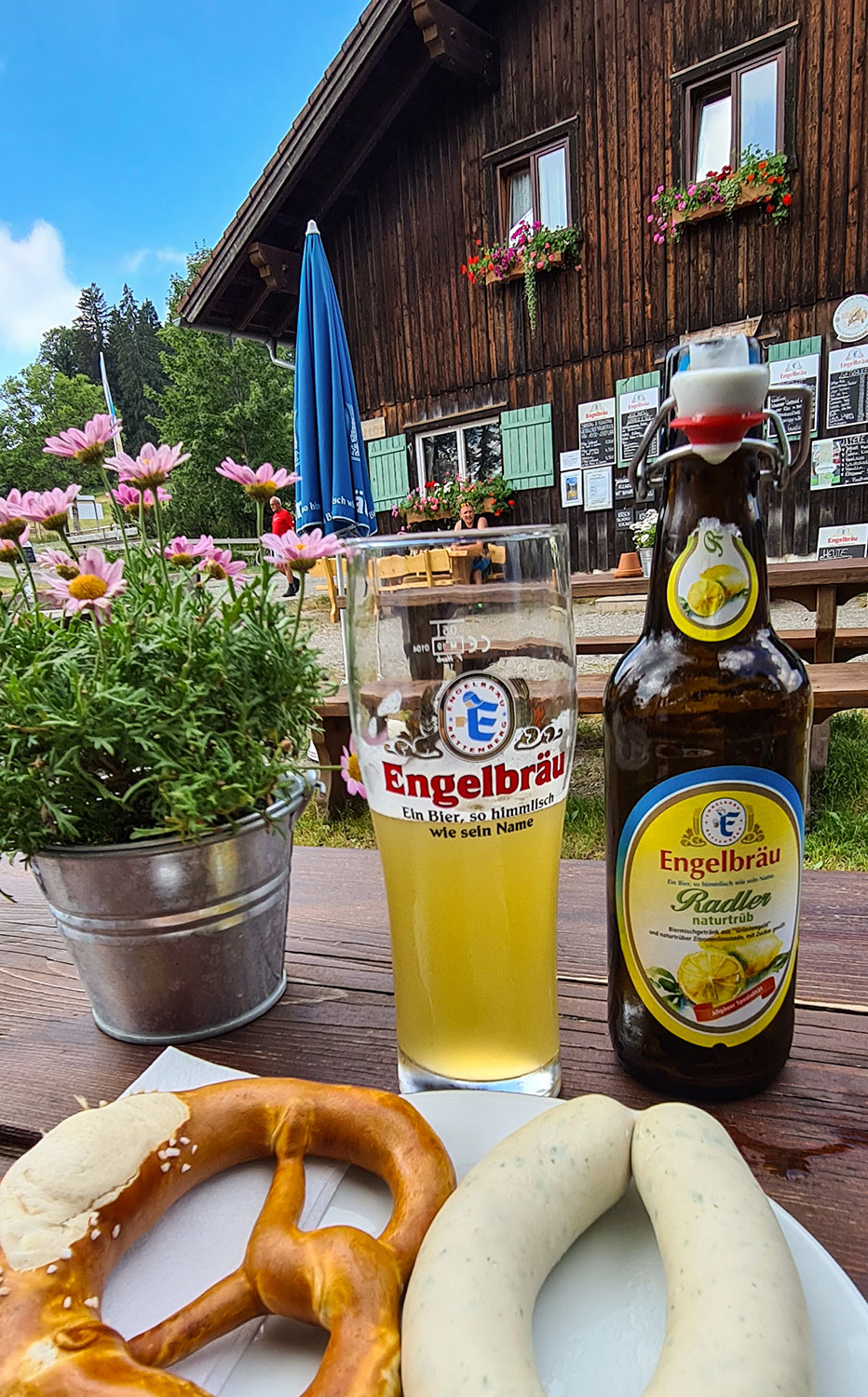 Wir schleichen uns an der Berg heran und fahren mit dem Auto den Umweg über Bayern. Eine kleine Mautstraße führt zur Wenger Egg Alpe. Von dort sind es zwanzig Minuten zu Fuß bergauf. Den Aufstieg heben wir uns für später auf – wenn es Ralph wieder besser geht. An diesem Sonntag genießen wir den Ausblick auf den Schwarzen Grat und das bayerische Weißwurstfrühstück. Prost!