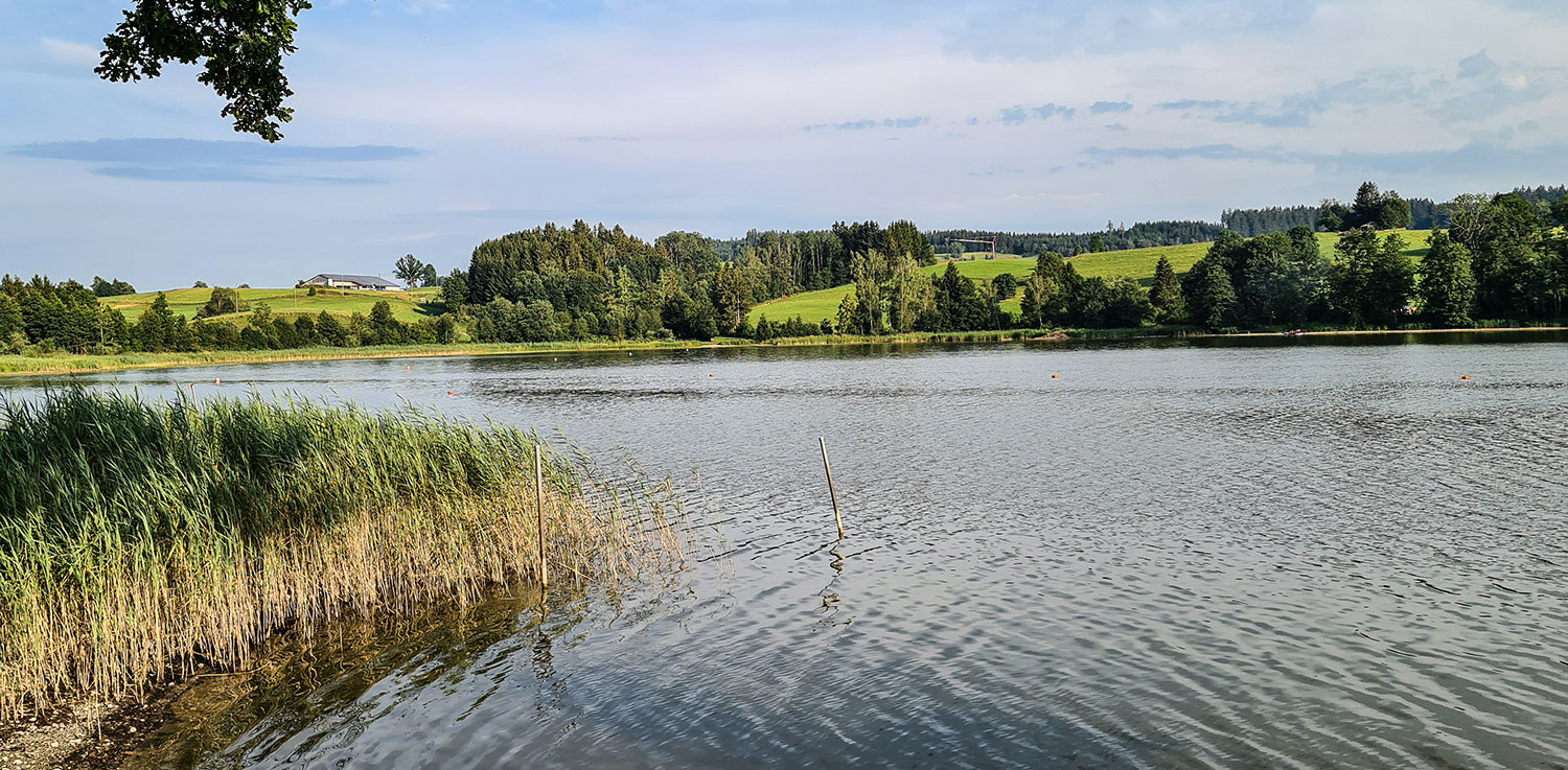 Südlich von Bad Wurzach geht die Landschaft allmählich ins Allgäu über. Es folgen Gospoldshofen, Herbrazhofen und Leutkirch. Sanfte, saftig grüne Hügel schieben sich ins Bild, in den Senken finden sich kleine Moorseen und idyllische Badeplätze. An solch einem Badesee zwischen Leutkirch und Isny zelten wir. Ein netter Campingplatz bei einem Bauernhof.