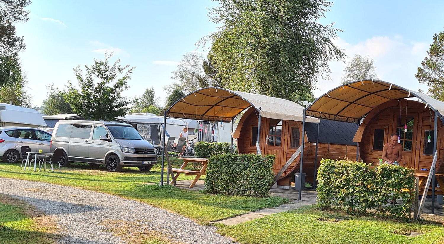 Der Campingplatz liegt direkt am Ufer des Sees. Der Badsee ist ein Moorsee, der sich durch sein braunes Wasser sehr schnell erwärmt und wohl auch Heil bringende Wirkung hat. Außerdem gibt es eine Surfschule und einen Bootsverleih. Wir haben gezeltet, die Schlaffässer auf dem Platz finde ich auch sehr cool. Ein idyllischer Campingplatz, bei dem man an jeder Ecke merkt, dass die Betreiber mit viel Herzblut dabei sind.