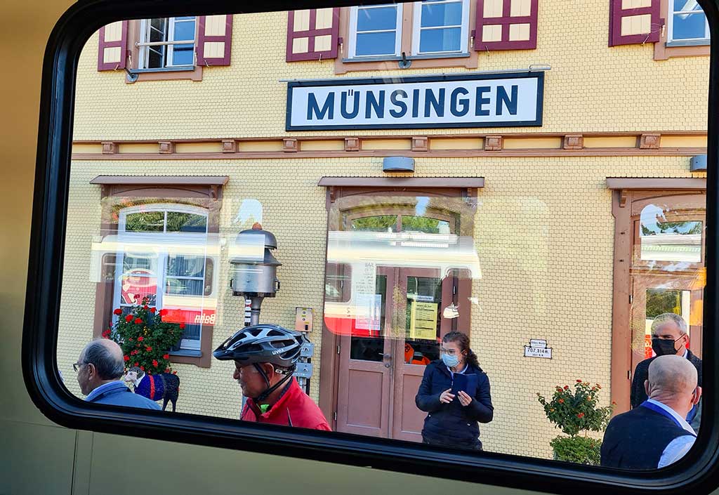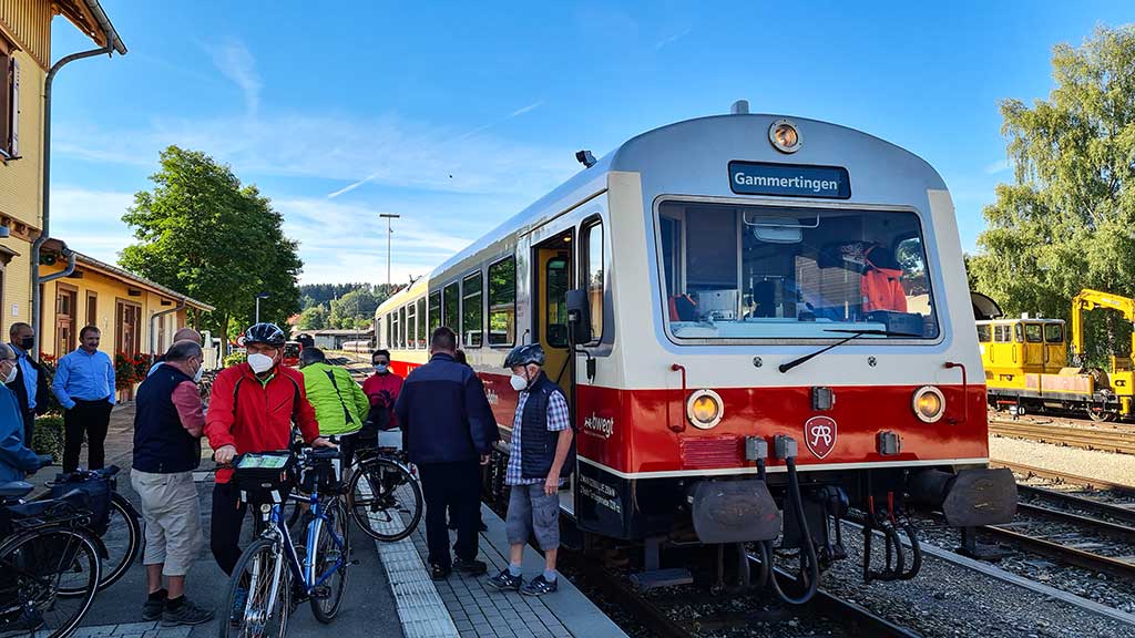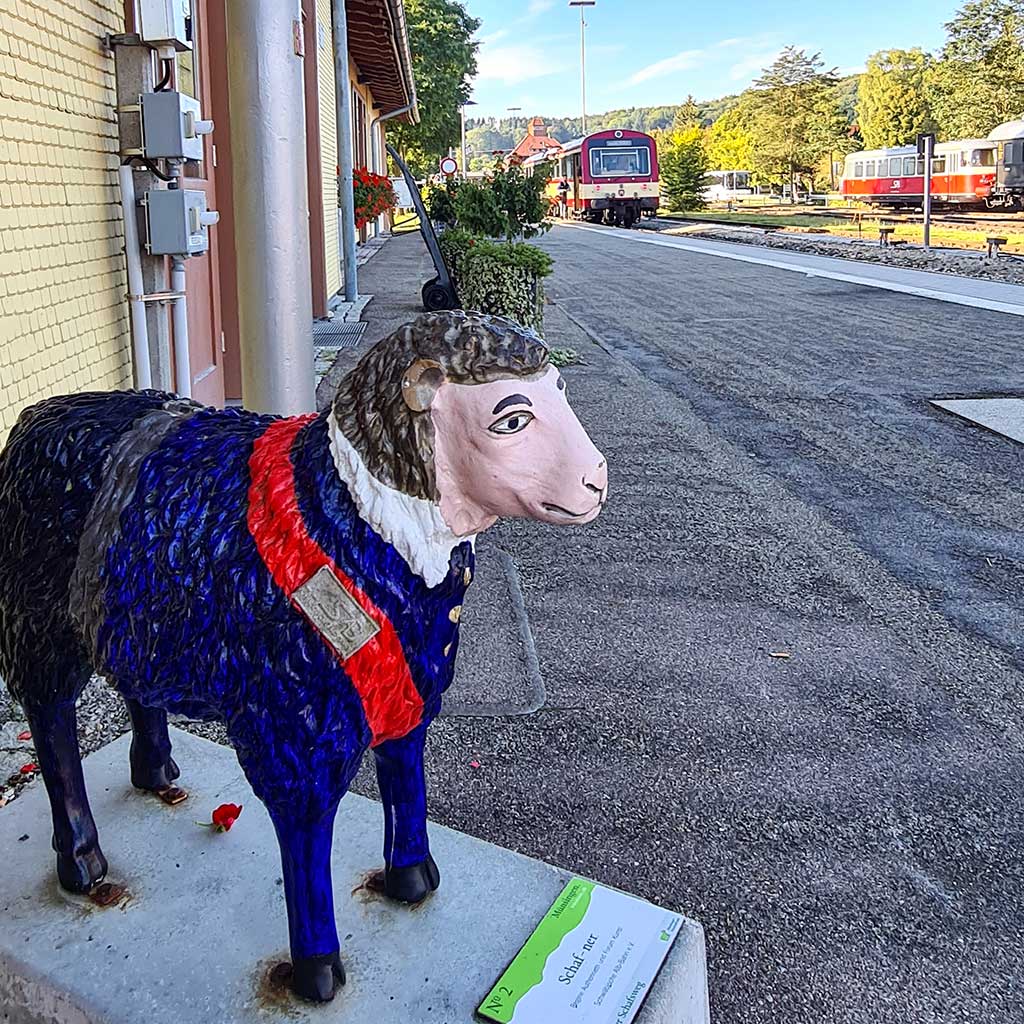 Lustig sieht das „Schaf-ner“-Schaf auf Gleis 1 aus. Dann kommt die Bahn. Statt Bäuerle mit Kälble steigt ein Trupp Rentner mit flotten E-Bikes aus. Jetzt aber rein in den Zug. Die Schaffnerin kontrolliert die Tickets und fragt jeden, wo er aussteigen möchte. Anscheinend wird heute nur Halt gemacht, wo unbedingt nötig. Grafeneck und Marbach ziehen vorbei und schon sind wir in Gomadingen.