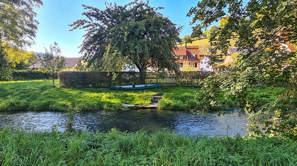 Die Wegeführung in Hundersingen ist etwas verzwickt, weil gerade alle Straßen aufgerissen sind. Doch grundsätzlich geht es immer an der Lauter entlang. So langsam verzieht sich die Sonne aus dem Tal, die Schatten werden länger. Es ist schon zienlich spät und so beschließe ich in Bichishausen nicht weiterzuwandern, sondern den Bus zu nehmen. Mist, der Erste fährt mir am Bootshaus gerade vor der Nase weg. Also wandere ich noch durch den Ort mit der schönen Kirche und warte beim Gasthof Hirsch auf den Nächsten. Um acht Uhr abends bin ich dann wieder beim Wohnwagen in Münsingen.