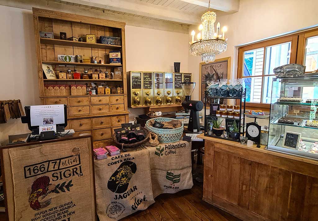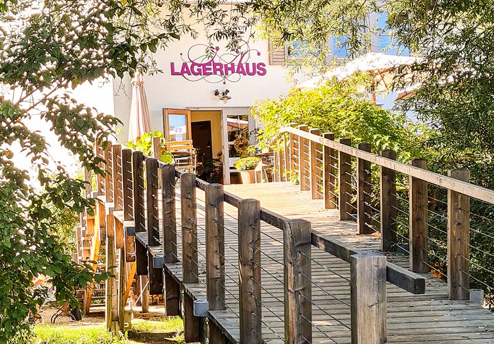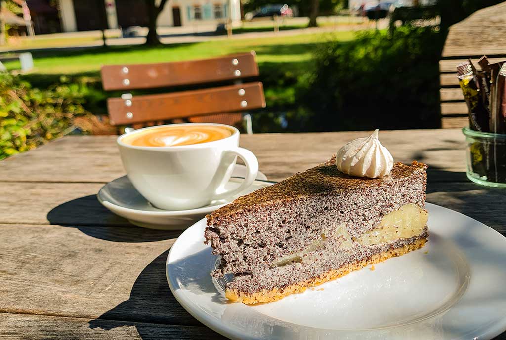 Kurz vor Dapfen führt mich der HW 5 die Martinssteige hinauf zur Martins-Kirche und anschließend hinab zur Ortsmitte. Das Lagerhaus ist mein nächstes Ziel. Ich entdecke ein rotbraun gestrichenes Holzhaus, das könnte es sein. „Nein, sie seien nicht das Lagerhaus, sondern ein Demeterversand“. Die beiden Frauen, die Obst- und Gemüsekisten stapeln, zeigen die Straße hinab, es sei nicht mehr weit und schenken mir ein Apfel. Ein paar Hundert Meter später erreiche ich das Lagerhaus. Von außen sieht es unscheinbar aus, doch drinnen ist es eine Wucht. Das Lagerhaus ist eine Mischung aus Café, Kaffeerösterei, Chocolaterie und Seifenmanufaktur… Sehr liebevoll und mit viel Gespür fürs Detail eingerichtet. Drinnen sitzen wäre schön, doch weil das Wetter so herrlich ist, entscheide ich mich für einen Platz im Biergarten direkt an der Lauter. Und lecker, diese Birnenmohntorte…