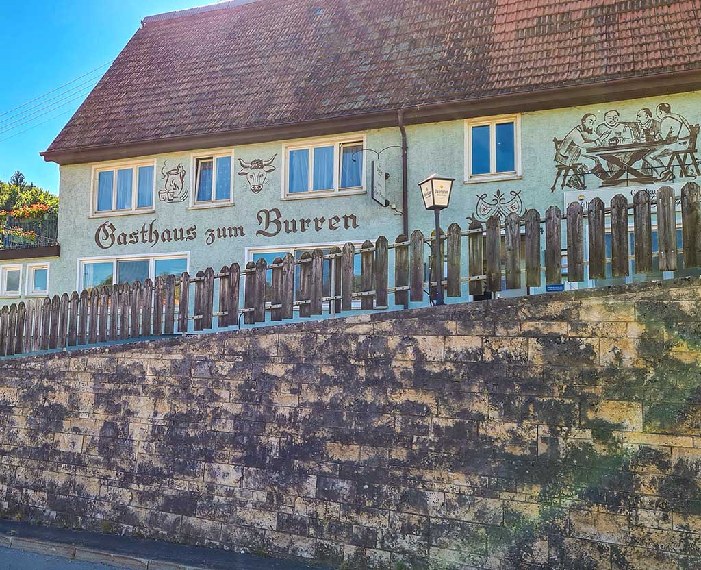 Zwischen Dapfen und Wasserstetten hing nahezu an jedem Baum ein Zettel mit der Aufschrift: Spanferkelessen am 3. Oktober im Burren. Und ich kann euch heute schon verraten. Ich war da am 3. Oktober zusammen mit Ralph und Freunden im Burren. Der Wirt Siegfried Rapp kocht selbst. Das Spanferkel hat sehr lecker geschmeckt, der Zwiebelrostbraten mit Bratkartoffeln ebenfalls. Wir waren die einzigen Touristen, alle anderen Gäste Einheimische. Der Wirt ist supernett, die Preise sind fair und dazu eine Einrichtung, von der du denkst, die gibt es nicht mehr! Wir waren alle vier begeistert.