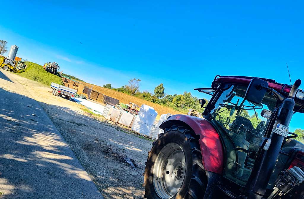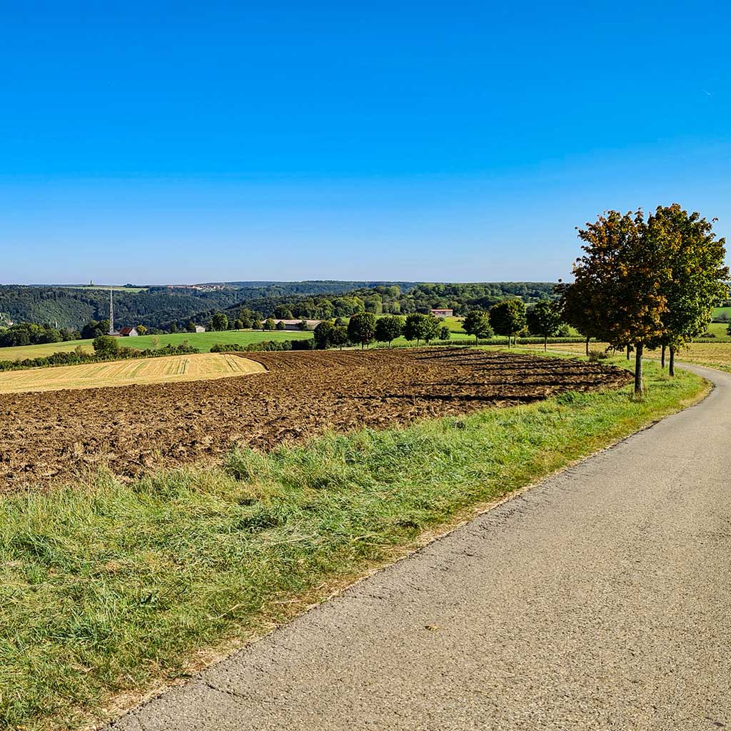 Hinter Wasserstetten verabschiedet sich der HW 5 vom Tal. Plötzlich bin ich wieder allein unterwegs. Es geht ziemlich steil bergauf und dann am Waldrand entlang vorbei an frisch gepflügten Feldern. Nicht ganz bis auf die Kuppe des Schachen, sondern rechts am Fladhof vorbei, wo sie mit mächtigen Traktoren Maissilage einfahren. Ansonsten ist hier oben nichts los, ich genieße die Einsamkeit und den weiten Blick. Bis zur Burg Derneck sind es immer noch 9,5 Kilometer und so langsam dämmert mir, dass ich das heute wohl nicht mehr schaffen werde. Beim Skilift von Hundersingen verpasse ich den Abstieg über den HW 5 und folge der Landstraße hinab nach Hundersingen.