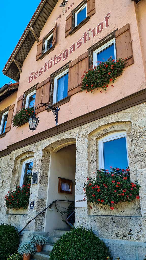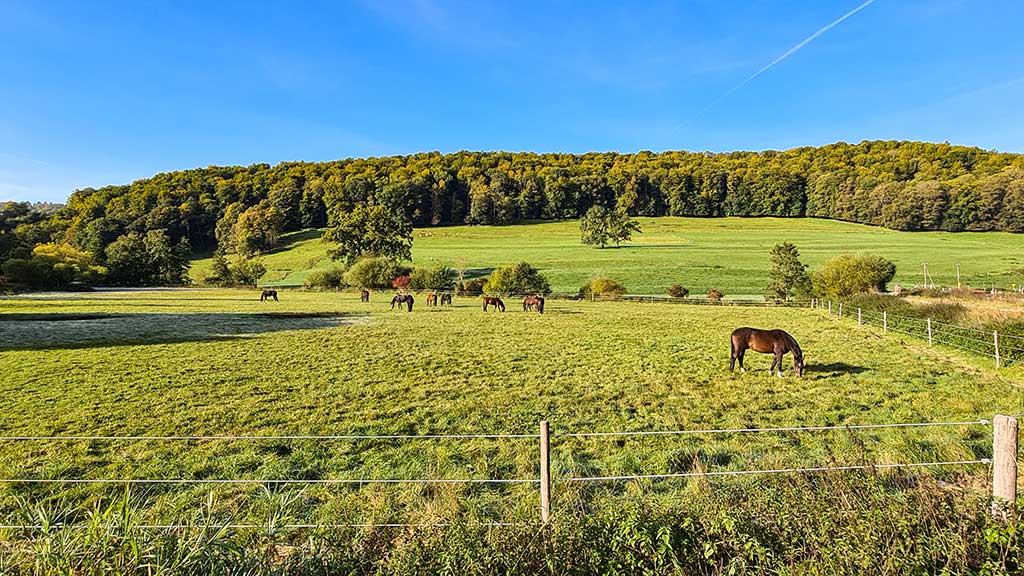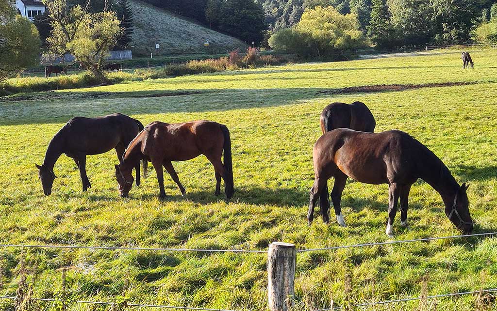Friedlich grasen sie auf der Wiese. Landidylle pur. Ich schaue mir noch den Gestütsgasthof und die Landesreitschule an und folge dann dem Lautertal-Radweg an der Landstraße entlang Richtung Dapfen.