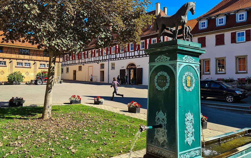 Das Haupt-und Landgestüt Marbach ist das älteste staatliche Gestüt Deutschlands. Es hat eine über 500-jährige Pferde-Tradition und ist weltberühmt für seine Vollblut-Araberzucht. Nach der Corona-Zwangspause 2020 finden in diesem Jahr wieder die Hengstparaden statt. An dem Donnerstagmorgen sind die Vorbereitungen dafür in vollem Gange: Absperrungen für die Zuschauer werden aufgebaut und junge Reiter eilen über den Hof zu den Proben. Leider kann ich nicht in die Ställe, aber auf den Koppeln rundum entdecke ich Stuten und Fohlen.
