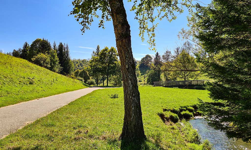 Tschüss Eisenbähnle. Inzwischen ist es 11 Uhr und endlich kann ich loswandern. Ein bisschen paradox, denn ich gehe jetzt an den Gleisen entlang wieder zurück nach Marbach. Am Ortsausgang von Gomadingen ist ein schöner Wasserspielplatz mit Grillstelle. Solche Spielplätze ziehen sich durch das gesamte Lautertal bis zur Mündung und wohl auch deshalb ist das Tal der Großen Lauter so beliebt bei Familien mit Kindern. Ausnahmsweise folge ich nicht dem HW 5 auf die Halbhöhe, sondern bleibe im Tal bis Marbach. Ich möchte unbedingt den Gestütshof anschauen.