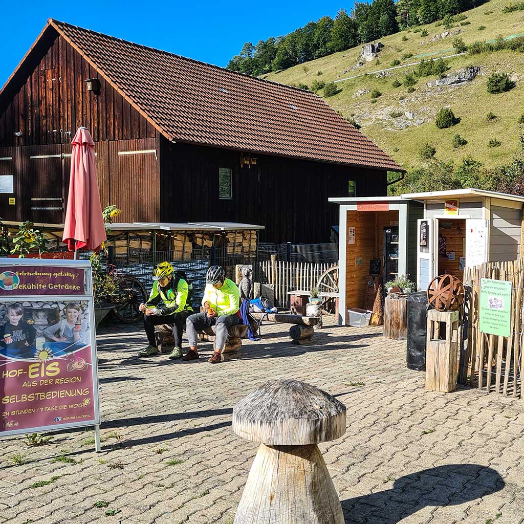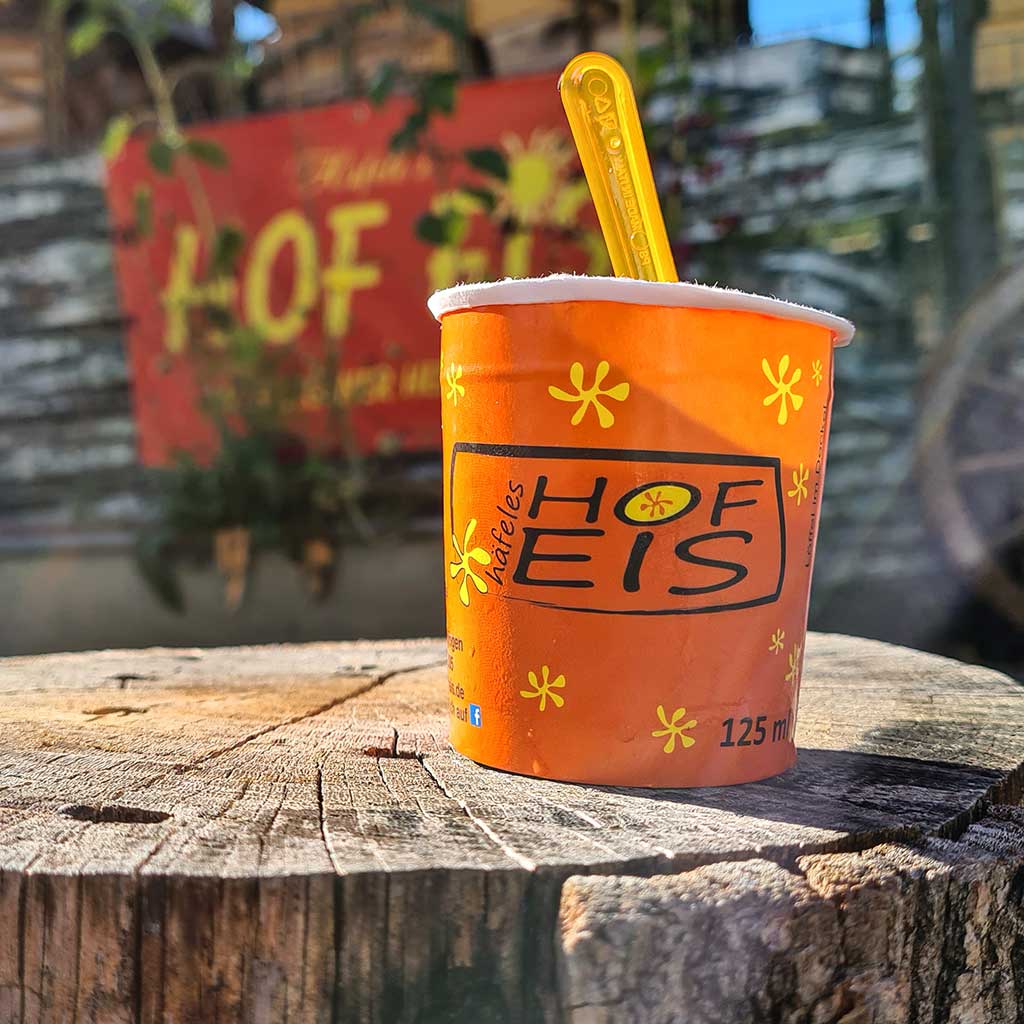 Dort lockt die nächste süße Versuchung: Bei Manz im Lädle gibt es leckere Hof-Eis. Statt schnellen Schrittes weiter zu marschieren, löffle ich vom Haselnuss-Eis und unterhalte mich mit einem netten Radlerehepaar, das hier ebenfalls rastet.
