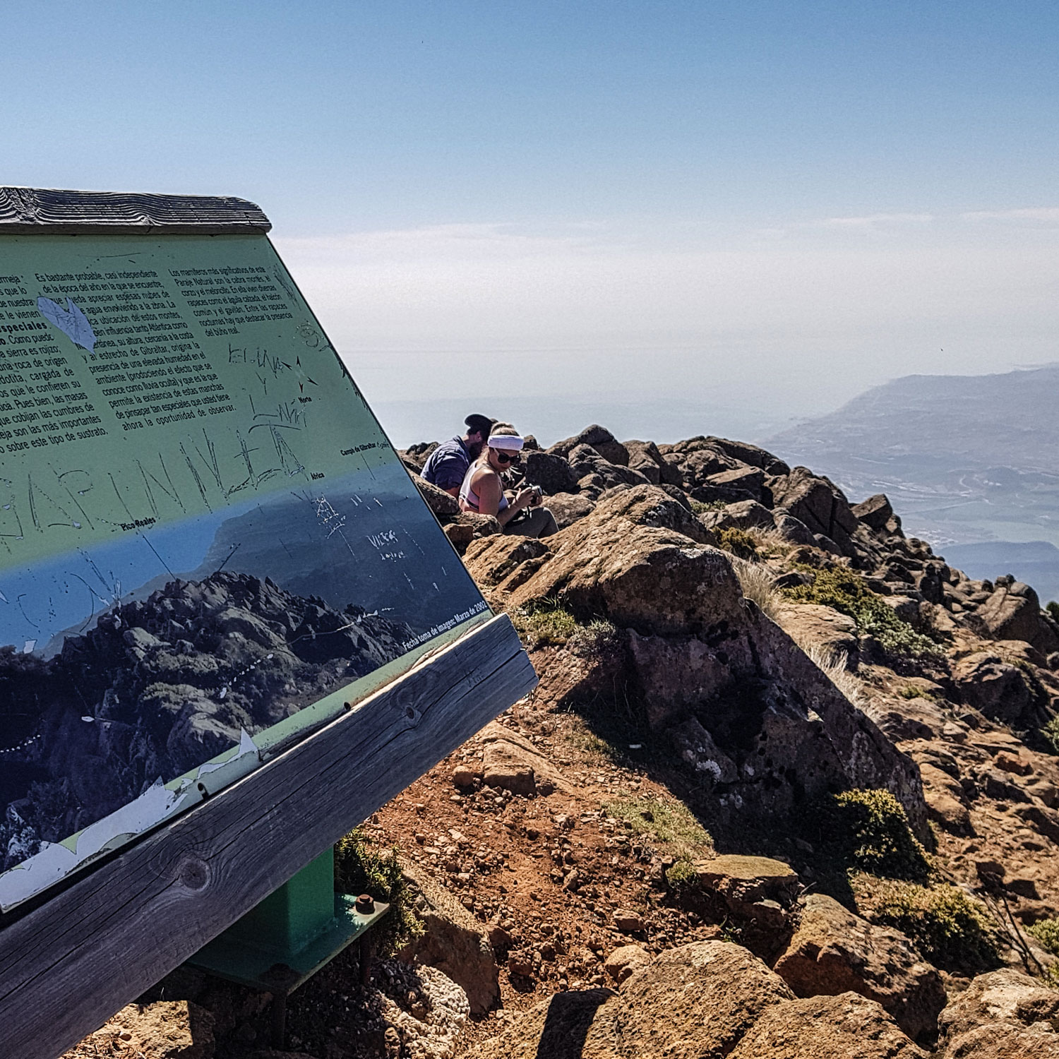 Je weiter wir uns dem Gipfel Los Reales nähern (1.452 Meter hoch), desto rauher wird die Umgebung. Der Weg führt über Felsen und durch Geröllabschnitte. Wir sind froh über unsere trittfesten Wanderschuhe. An einigen Stellen ist die Wegmarkierung mit den weißen Pfeilen und Kreuzen nicht ganz eindeutig. Eine detaillierte Wanderkarte wäre hilfreich gewesen, die hatten wir aber nicht dabei. Und obwohl die Rundwanderung nur 6,5 Kilometer lang ist, verlangt sie uns doch einiges ab. Besonders auf den offenen Abschnitten, wo wir der andalusischen Sonne ausgesetzt sind. Im Hochsommer würde ich ihn nicht gehen.