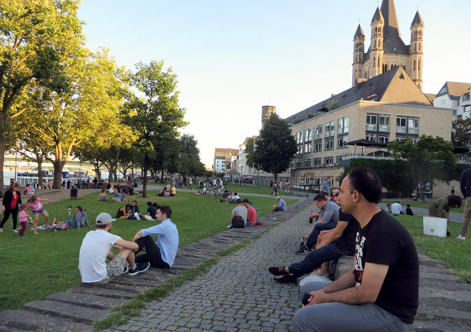 Abends bin ich dann zusammen mit Jean-Luc noch mal zum Dom gefahren. Für den Aufstieg auf den Turm ist es schon zu spät (im Sommer bis 18 Uhr möglich), stattdessen genießen wir den schönen Sommerabend am Rheinufer – zusammen mit vielen Kölnern und anderen Touristen.