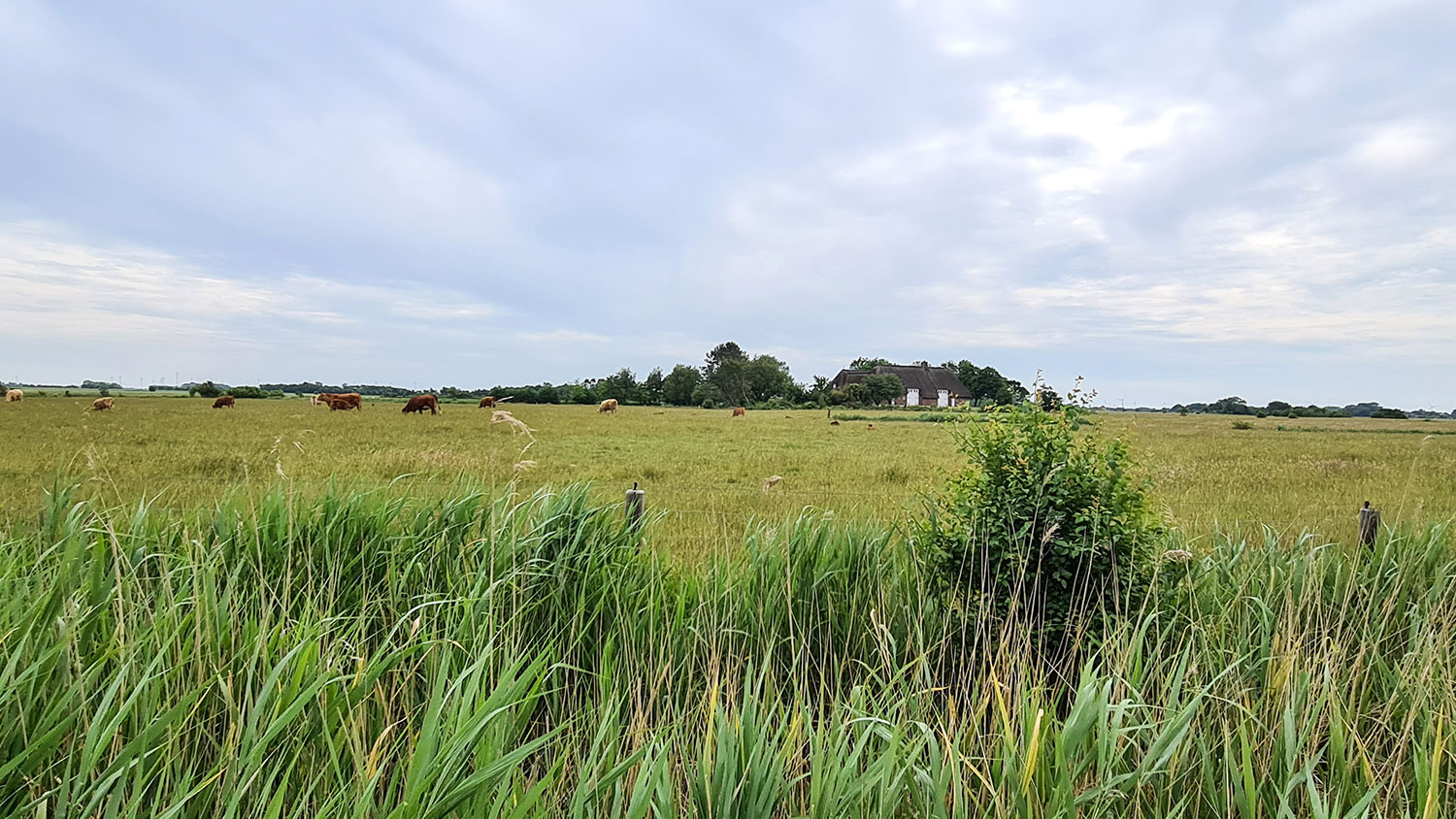 Wir kommen von Leck und sind auf dem Weg nach Dänemark. Kurz hinter Süderlügum weist ein Schild nach links: Nolde Stiftung Seebüll. Ralph, der schon einmal vor 40 Jahren dort war, nickt auf meinen Vorschlag, das Museum zu besuchen. Also verlassen wir die Bundesstraße 5 und folgen der Landstraße Richtung Westen. Es ist eine weite Landschaft mit Viehweiden, Gräben und hohem Schilfgras. Nur ab und zu ein Bauernhof. Dann folgt die Auffahrt nach Seebüll.