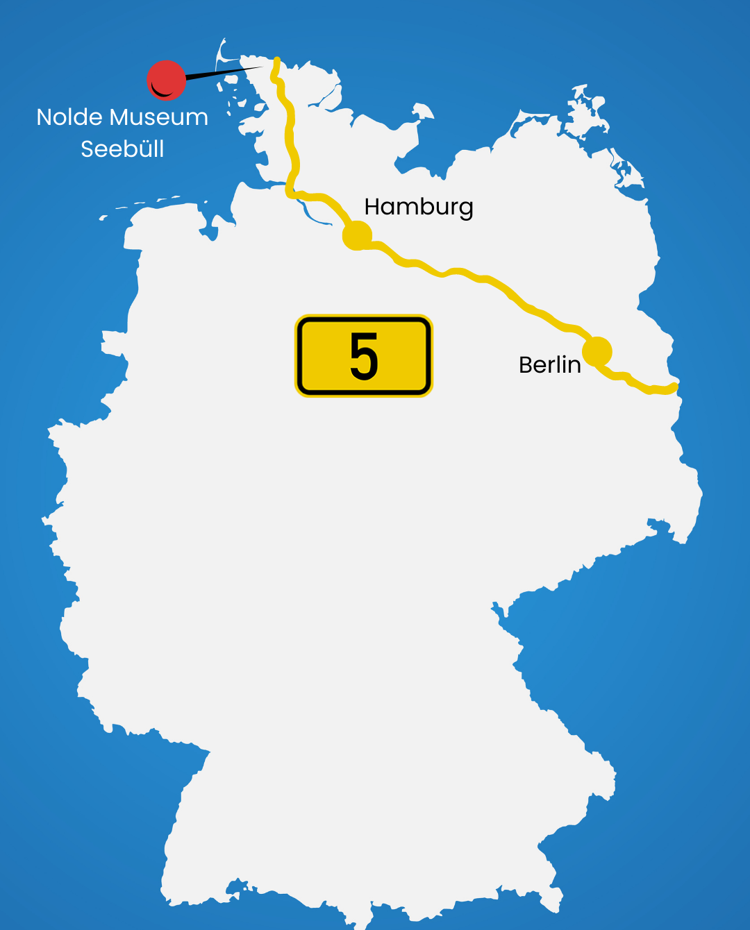 Warum findest du diesen Beitrag auf meinem Blog? Nun, das Nolde Museum liegt nur zehn Autominuten von der Bundesstraße B 5 entfernt. Diese beginnt an der dänischen Grenze (Böglum / Sæd) und führt über Hamburg und Berlin bis zur polnischen Grenze bei Frankfurt an der Oder. Die Fernstraße ist 555 Kilometer lang und hat eine interessante Geschichte. Das Nolde Museum ist quasi das erste Highlight nahe der dänischen Grenze. Den weiteren Verlauf der B5 werde ich sicherlich auch noch abfahren und darüber berichten.