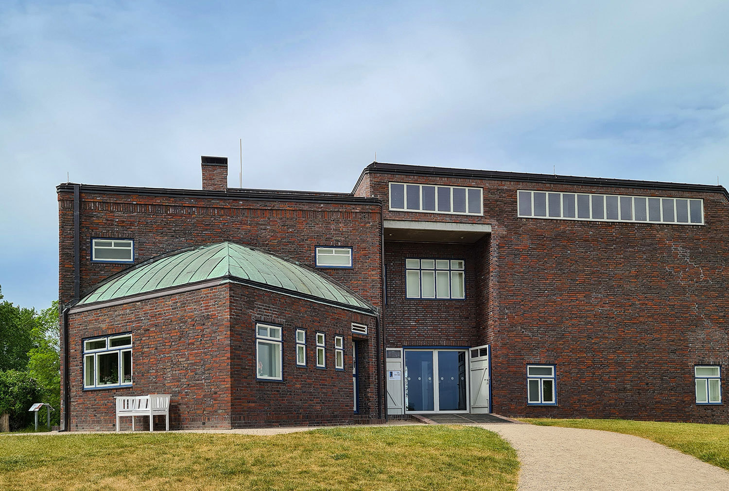 Das Wohnhaus liegt auf einer kleinen Anhöhe. Es ist ein Klinkerbau ohne Schnörkel. Anordnung und Reihung der Fenster sind im Stil der neuen Sachlichkeit und des Bauhaus.