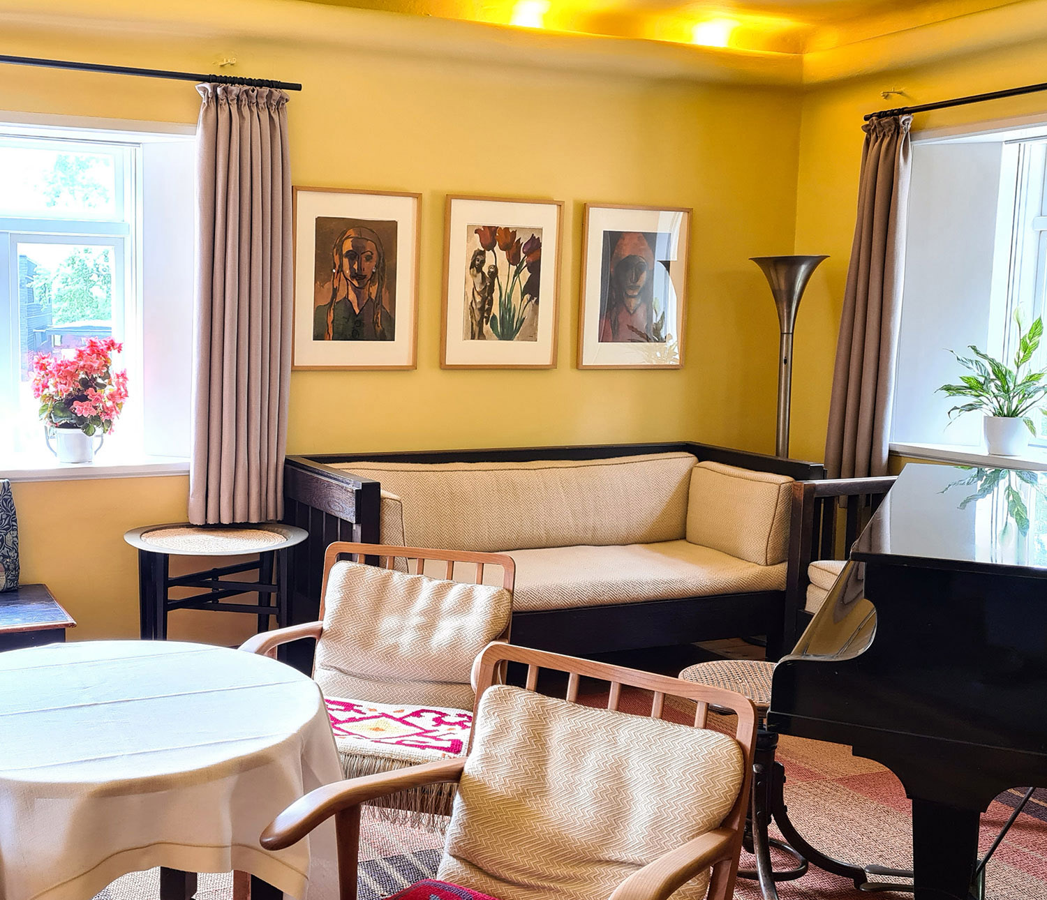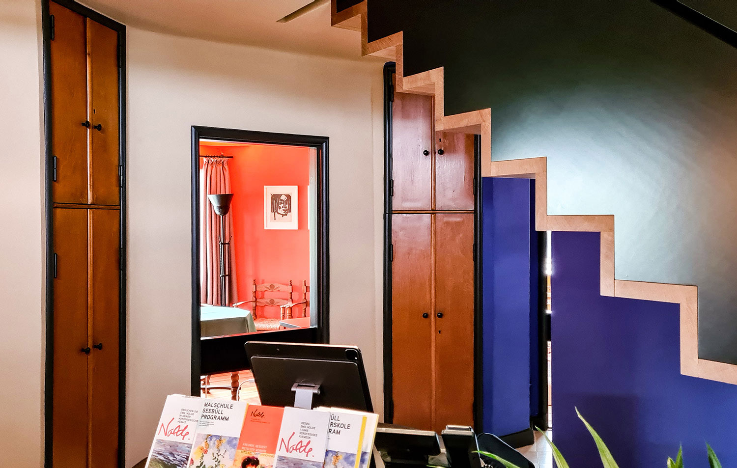 Drinnen erwartet den Besucher dann eine Farbexplosion. Jeder Raum wurde in einer kräftigen Farbe gestrichen: azurblau der Flur, leuchtend orange das Esszimmer, gelb das Wohnzimmer. Emil Nolde hatte die Wandfarben einst selbst ausgesucht und jetzt nach der Renovierung kann man wieder erkennen, wie intensiv die Farben ursprünglich waren. Die Wände vom Atelier und Bildersaal sind dann zurückhaltender in weiß gehalten. Denn hier hängen ja die farbenfrohen Werke des Malers.