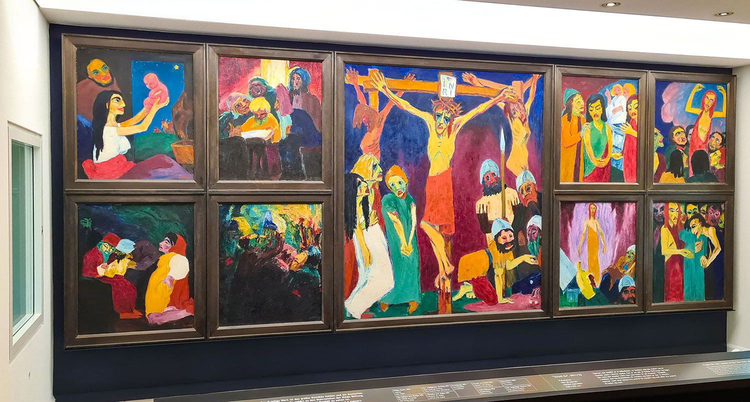 Im ehemaligen Atelier, das zu Lebenszeiten nur der Künstler betreten durfte, wird ein Hauptwerk Noldes gezeigt: „Das Leben Christi“ von 1911/12 setzt sich aus neun Einzelbildern zusammen und thematisiert Stationen im Leben des Heilands. Sehr gut gefallen mir auch die anderen Werke mit biblischen Motiven wie die „Philister“, „Verlorenes Paradies“ und „Pharaos Tochter findet Moses“.